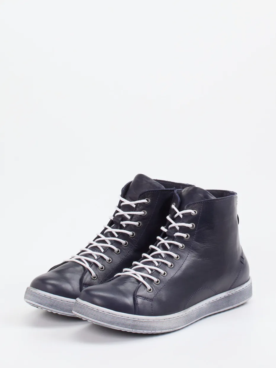 Minimalistisch trifft funktional.Andrea Conti bringt mit dieser Schnürstiefelette im High-Top-Stil einen urbanen Sneaker auf die Straße. Für Tage mit hoher Taktung überzeugt das Modell mit butterweichem, nachtblauem Kalbleder auf anatomischem Leisten. Die matte Oberfläche, silberfarbene Ösen, weiße Kontrast-Schnürsenkel und ein seitlicher Reißverschluss prägen das klare Streetwear-Design. Eine profilierte Gummisohle im Used-Look sorgt für Halt und ergänzt die alltagstaugliche Ausstattung. Ideal kombinierbar mit Jeans, Jogpants oder Jersey-Kleid. Ein herausnehmbares Fußbett erhöht den Komfort. Markentypisch überzeugend durch unkomplizierte Funktionalität und modernes Understatement.