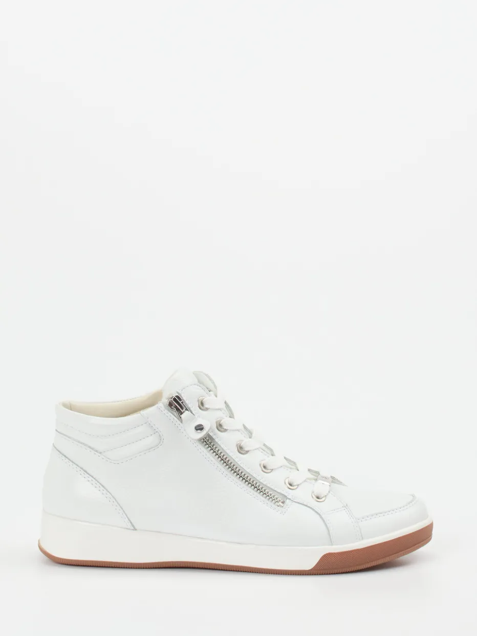 Softness trifft auf sportive Linien.Dieser High-Top-Sneaker von Ara vereint Komfort und cleane Ästhetik auf zeitgemäße Weise. Für entspannte Tage auf den Beinen sorgt das hochwertige, genarbte Kalbleder in Offwhite. Der knöchelhohe Schnitt garantiert Stabilität, während sich durch die Kombination aus Schnürung und silbernem Reißverschluss ein unkompliziertes An- und Ausziehen ergibt. Eine hellbraune Gummisohle mit strukturierter Profilierung sorgt für Trittsicherheit. Polsterung am Einstieg, weiches Frottee-Futter und ein herausnehmbares Fußbett bieten ein angenehmes Tragegefühl. Trendig im Streetwear-Kontext inszenierbar, besonders stilvoll zu Jogpants oder weißer Crossbody-Bag. Ara vereint gekonnt Alltagstauglichkeit mit durchdachtem Komfortdesign.
