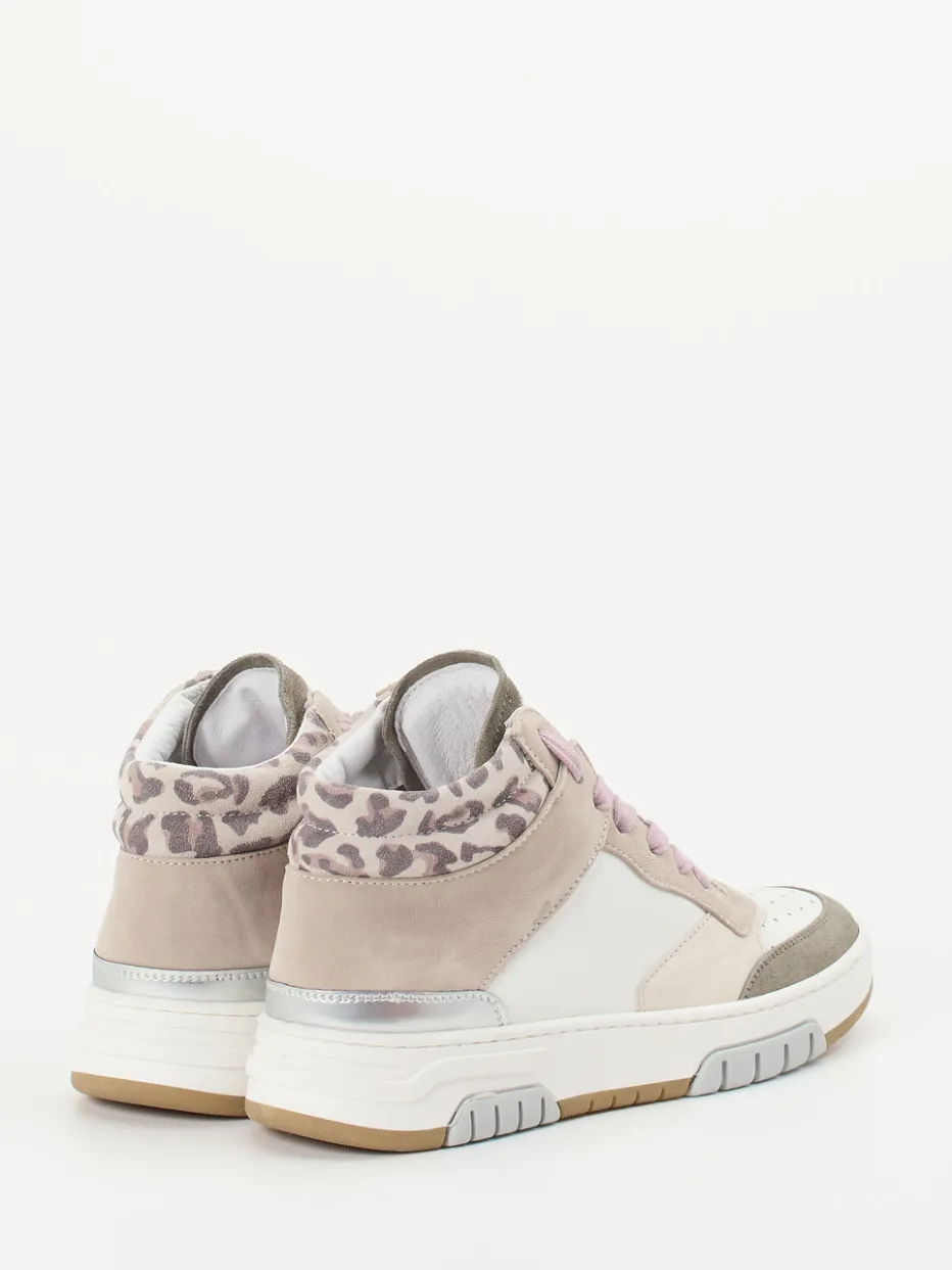 Für urbane Tage mit modischem Anspruch bietet der knöchelhohe Sneaker hohen Komfort bei besonderem Design. Weißes, weiches Kalbleder verbindet sich mit samtig-beigem und fliederfarbenem Veloursleder zu einem harmonischen Pastell-Farbspiel. Blickfang sind die silberfarbene Fersenkappe und das Tigermuster am Schaftrand. Die bequeme Schnürung, das gepolsterte Frottee-Innenfutter und die robuste Gummisohle sorgen für Funktionalität. Kombiniert mit Cropped Jeans entsteht ein trendstarker Ausdruck zwischen Streetwear und Retro-Chic.
