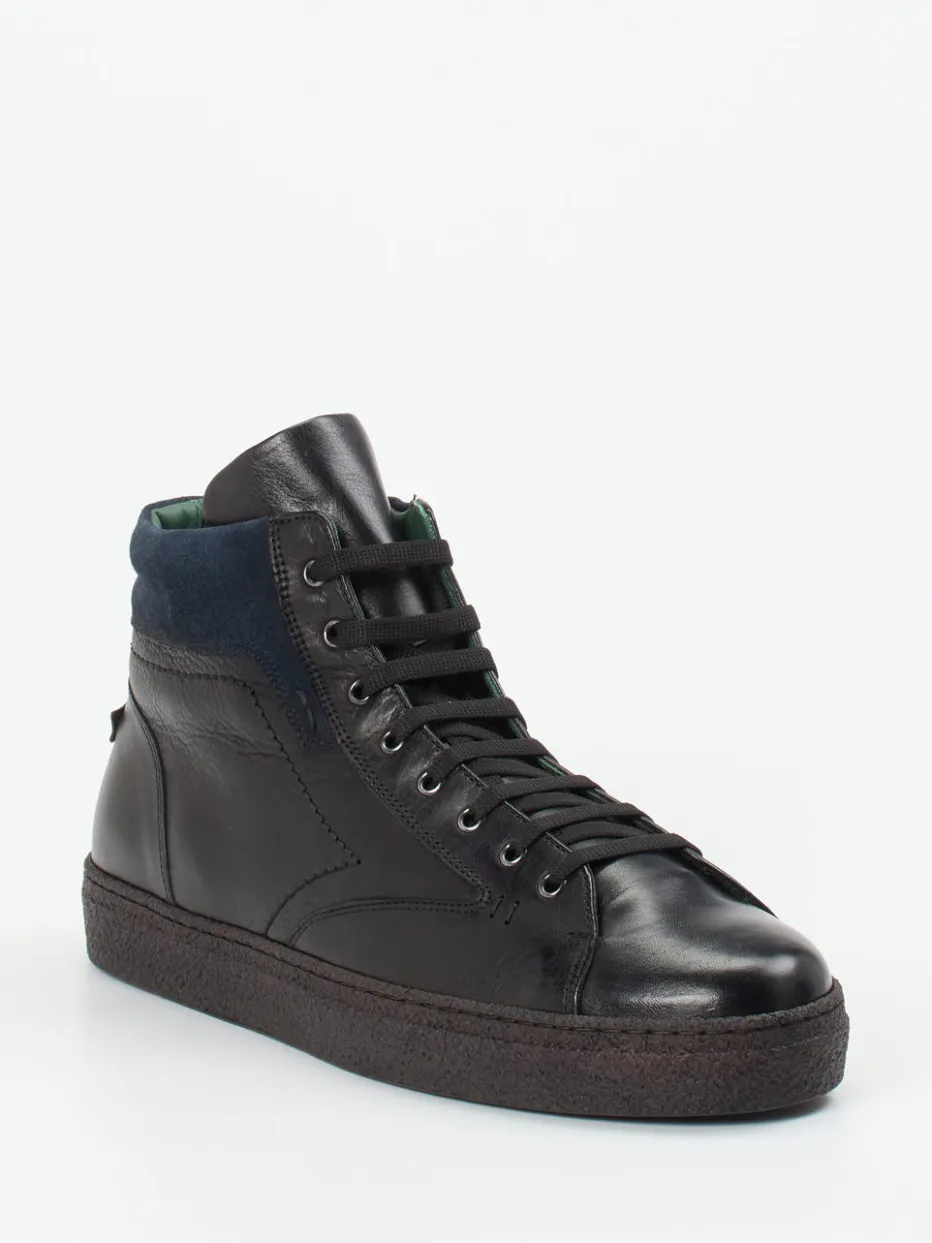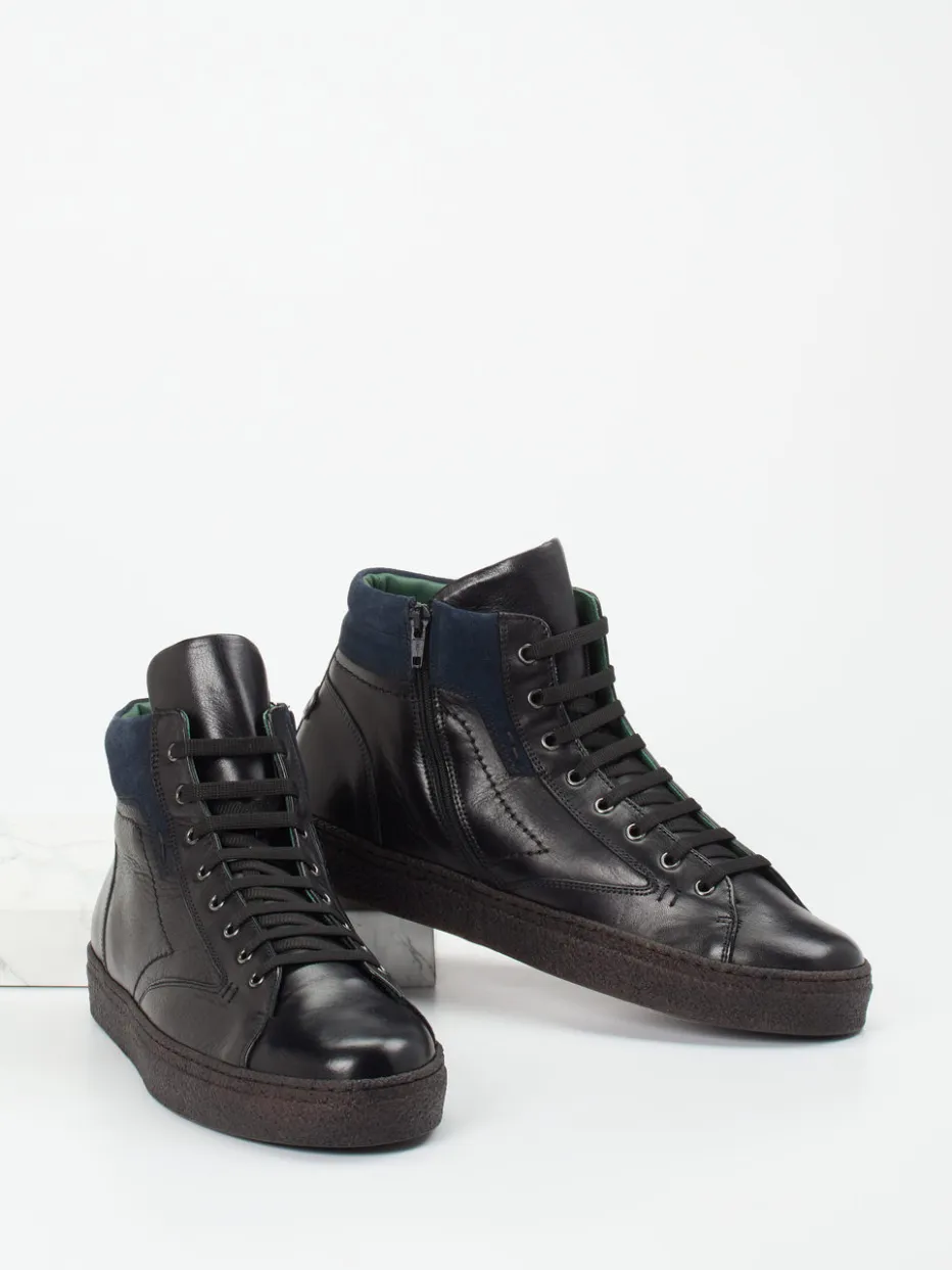 Wärme trifft auf urbanen Stil.Galizio Torresi präsentiert mit diesem High-Top-Sneaker ein Modell für Herren, das Komfort und Ästhetik gekonnt vereint. Für kalte Tage optimiert, überzeugt der Sneaker mit schwarzem Kalbleder in glänzender Optik, einem dunkelblauen Velourskragen und wärmendem Lammfellfutter in Tannengrün. Die knöchelhohe Silhouette wird durch eine cleane Linienführung, eine klassische Schnürung und einen verdeckten Innenreißverschluss ergänzt. Die schwarze Kreppsohle zeigt griffiges Profil und rundet das Design funktional ab. Inspirationsquellen wie Streetwear und „Quiet Luxury“-Stilrichtungen verleihen dem Modell zeitgemäßen Charakter. Ein urbaner Sneaker mit smarter Wärmeleistung und italienischer Raffinesse.