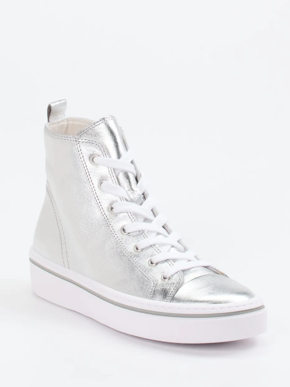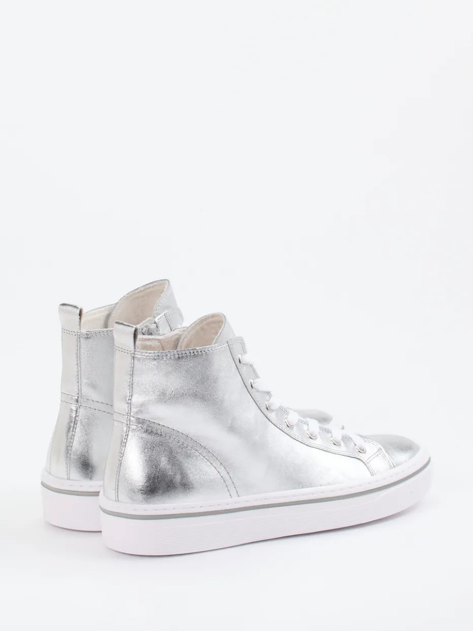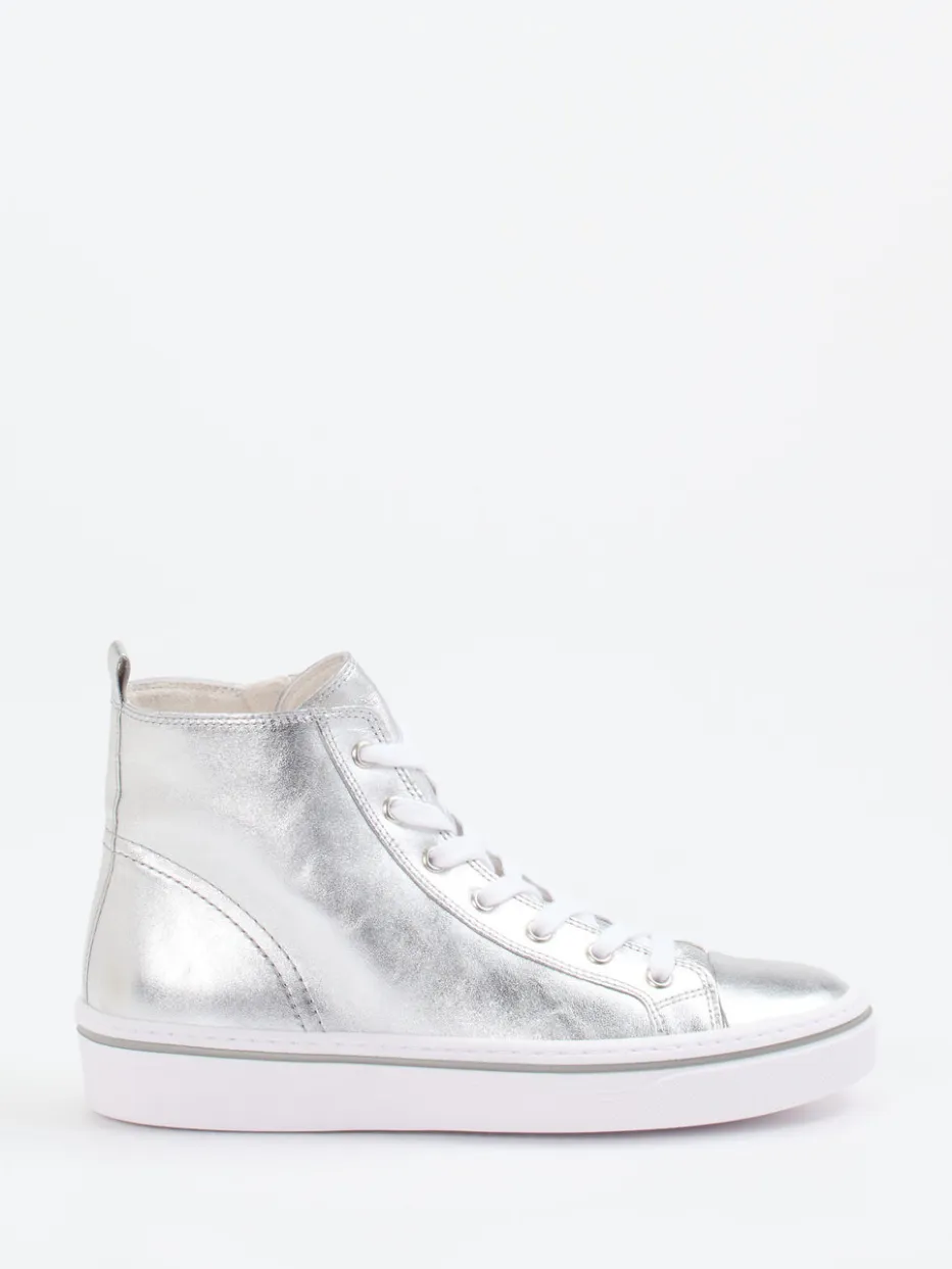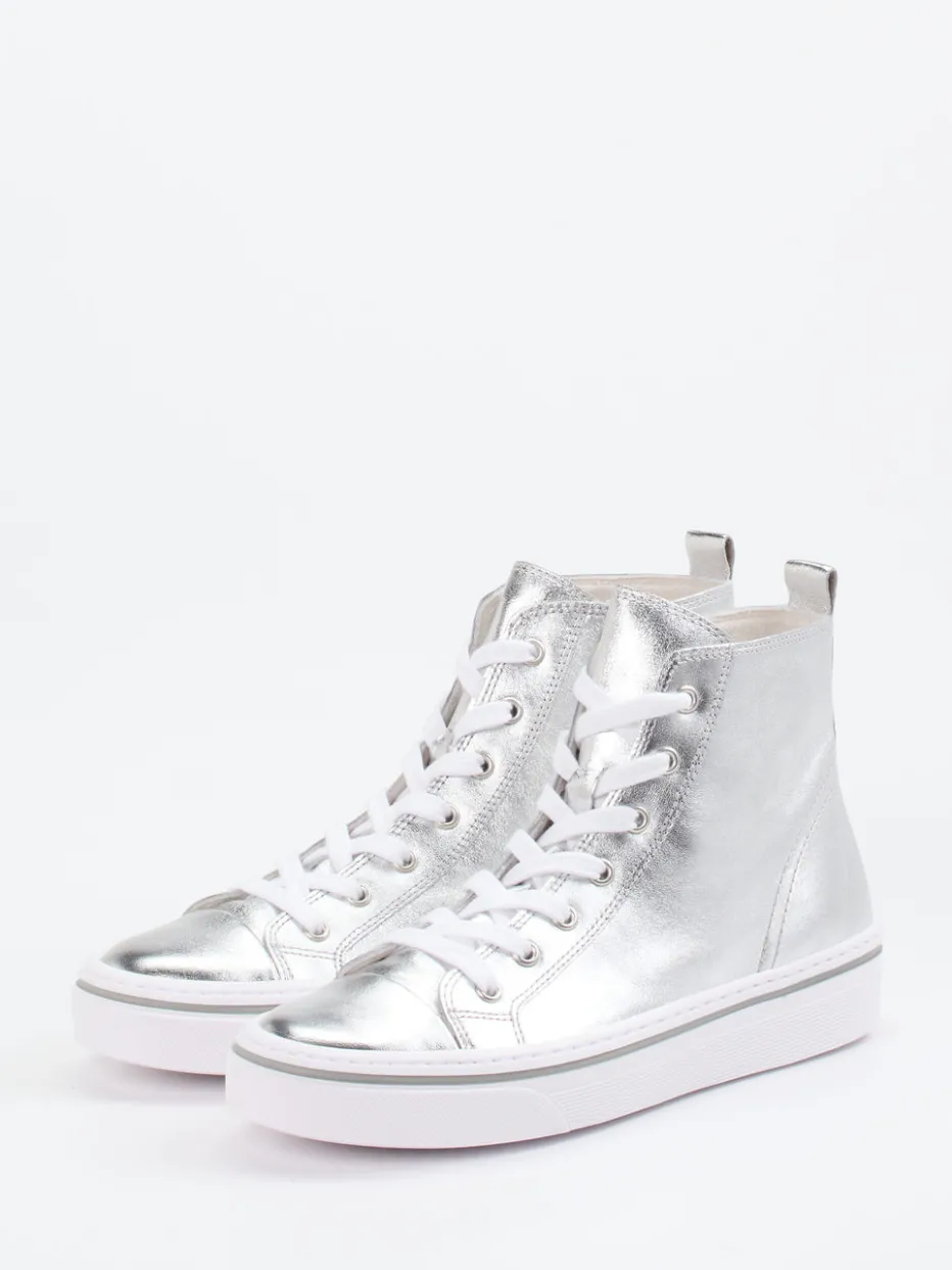 Silberfarbene High-Top-Sneaker von Gabor kombinieren metallischen Glanz mit funktionalem Komfort. Der seitliche Reißverschluss ergänzt die klassische Schnürung und unterstreicht das durchdachte Design.