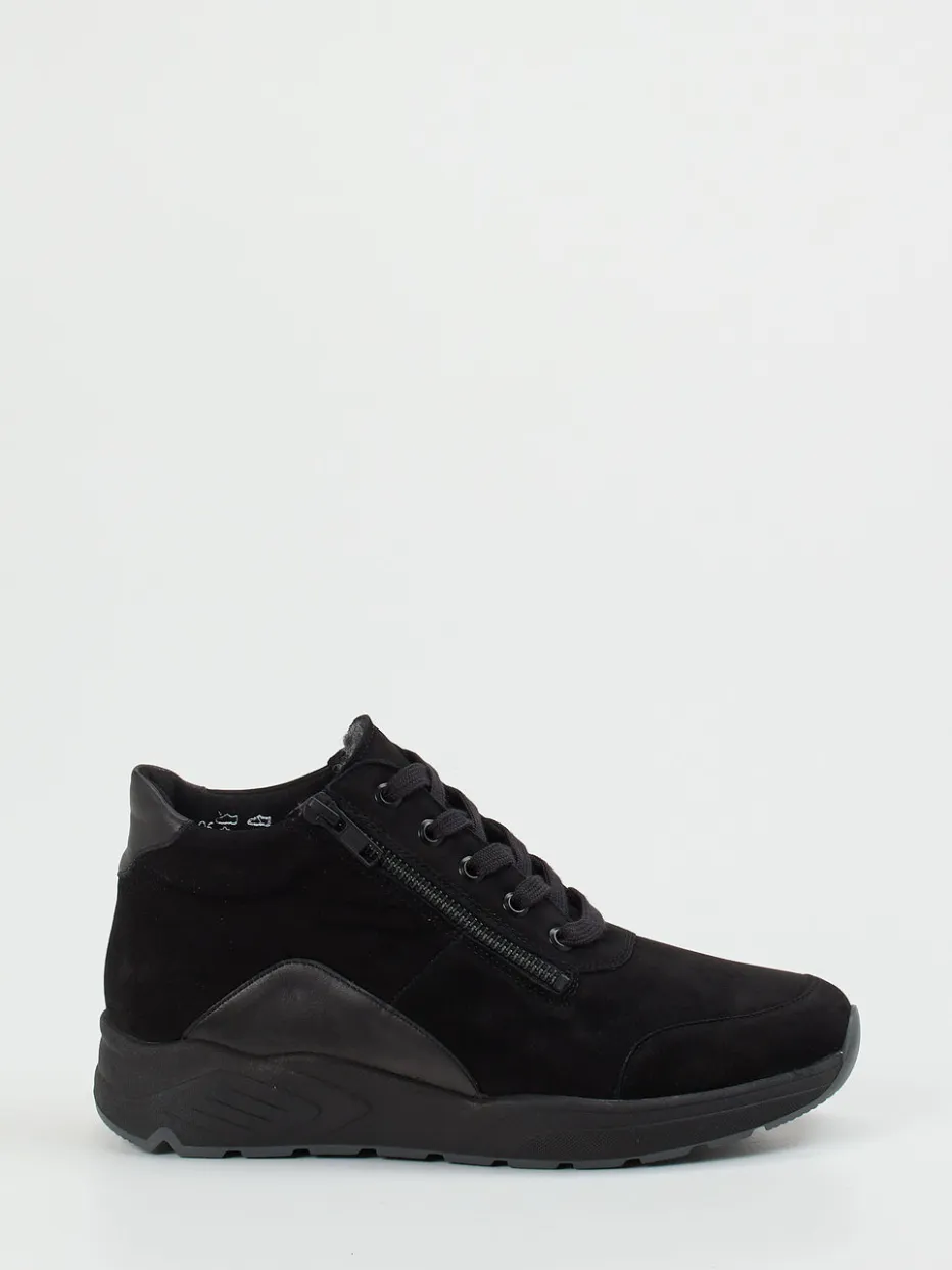 Komfort trifft sportives Understatement.Solidus präsentiert mit dieser schnürbaren Stiefelette aus der Linie Kea einen High-Top Sneaker für Damen. Bei kühlen Temperaturen sorgt das weiche Wollfutter für angenehme Wärme. Schwarzes Nubukleder, samtig angeschliffen, trifft auf dezente Glattleder-Akzente in der robusten Fersenpartie. Die sportlich-voluminöse, knöchelhohe Silhouette mit seitlichem Zipper und gepolstertem Schaft bietet optimalen Komfort. Eine griffig profilierte Gummisohle gewährleistet Trittsicherheit, während das ergonomisch geformte Wechselfußbett aus Kork für individuellen Laufkomfort sorgt. Der Look fügt sich stimmig in minimalistische All-Black-Outfits – etwa kombiniert mit Thermo-Leggings und Steppjacke. Solidus verbindet passgenauen Sitz mit durchdachter Funktion für moderne Wintermomente.