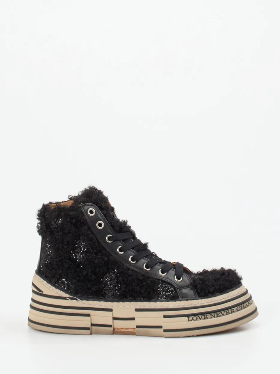 Markanter Look trifft auf innovativen Materialmix: Dieser High-Top von Rebecca White setzt mit Glitzer, Bouclé und Statement-Sohle neue Maßstäbe im femininen Streetwear-Stil.