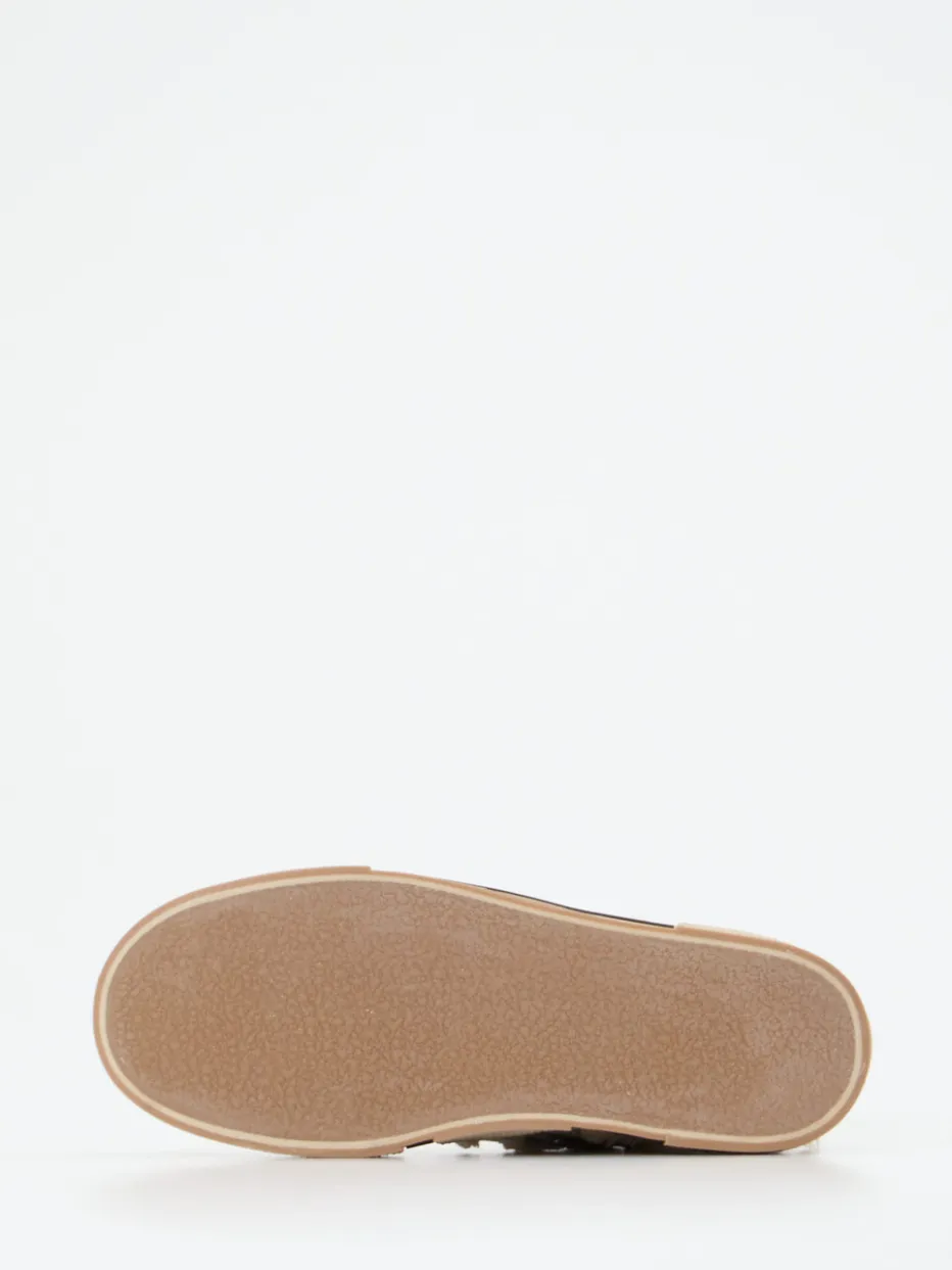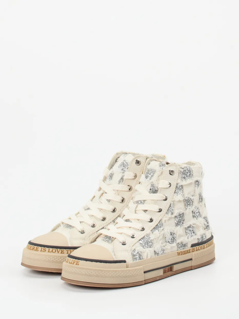 Ob für Festivals, Shoppingtouren oder lange Tage in der City – der Schuh überzeugt durch eine textilbasierte Oberfläche mit ausgeprägtem Glitzer-Karomuster, das auf fransigem Canvas einen spannenden Look erzeugt. Beige Grundfarbe trifft auf silberne Pailletten und einen kontrastreichen Statement-Schriftzug auf der Gummisohle. Der seitliche Reißverschluss ergänzt die klassische Schnürung für bequemes Anziehen. Stilistisch zwischen Y2K und Streetwear verortet, lässt sich das Modell bestens mit Oversize-Pieces kombinieren.