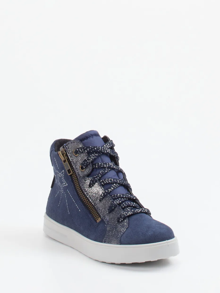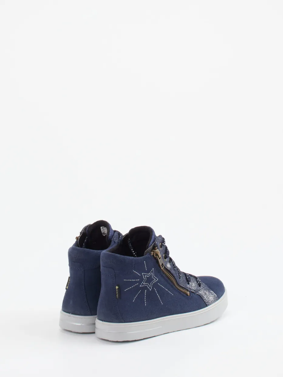 Glitzer trifft Komfort in dunklem Blau.Superfit präsentiert einen modischen High-Top-Sneaker für Kinder mit stilsicherem Design. Für Spielplatz, Schultag oder entspannte Nachmittage: Das Modell aus samtig angeschliffenem Veloursleder in Dunkelblau kombiniert Strapazierfähigkeit mit weichem Textilfutter. Optische Highlights wie Glitzerelemente entlang der Schnürung und eine seitliche Sternen-Stickerei unterstreichen den jugendlich urbanen Stil. Der seitliche Reißverschluss erleichtert das An- und Ausziehen und die PU-Sohle mit sternförmigem Profil sorgt für trittsicheren Halt. Inspiriert von Y2K- und Streetwear-Trends passt das Modell ideal zu Leggings oder Jeansjacke. Ein stylisches Kinderschuh-Modell mit durchdachtem Tragekomfort für jeden Tag.