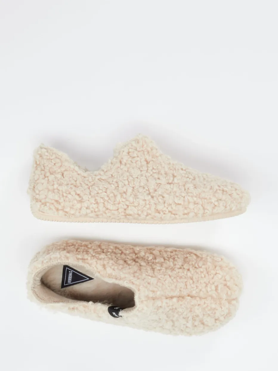 Ideal für entspannte Momente daheim überzeugt das Modell durch sein samtweiches Obermaterial aus Textil in floriger Teddy-Fleece-Optik. Das Cremebeige unterstreicht zusammen mit der abgerundeten Silhouette den ruhigen, minimalistischen Look. Ein elastischer Einstieg sorgt für leichtes An- und Ausziehen, während die profilierte Gummisohle sicheren Halt auf allen Innenflächen bietet. Scandi-inspirierte Loungewear und der Cocooning-Trend der Saison machen den Schuh zum stilvollen Begleiter für gemütliche Stunden. Harmoniert besonders gut mit weichen Loungewear-Teilen in Naturtönen.