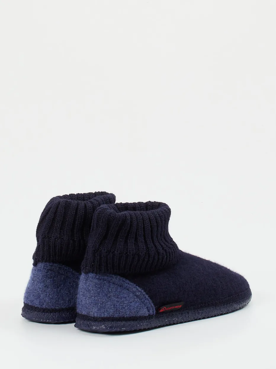Dank wärmendem Wollwalk bietet der Schuh ein ausgeglichenes Fußklima, während die samtig-filzige Oberfläche einen gemütlichen Eindruck hinterlässt. Der dunkelblaue Grundton mit hellblauer Fersenzone wirkt dezent lebendig. Der gestrickte Schaftabschluss und der sockenähnliche Einstieg ermöglichen unkompliziertes Anziehen und besten Halt. Die rutschfeste, naturkautschukbasierte Gummisohle unterstreicht den funktionalen Charakter. Die minimalistische Form passt perfekt zu entspannter Loungewear.