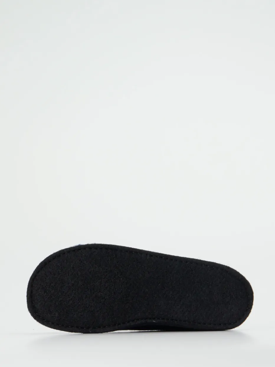 Ideal für gemütliche Abende zu Hause bietet dieser geschlossene Slip-on aus dunkelblauer, gewalkter Schurwolle einen warmen und atmungsaktiven Tragekomfort. Die matt strukturierte Oberfläche, kombiniert mit einem ergonomischen Schnitt und einer rutschhemmenden Filzsohle mit Latexbeschichtung, unterstreicht den funktionalen Anspruch. Die klassische Form mit rund zulaufender Vorderkappe und dezentes Metall-Emblem verleihen dem Modell einen reduzierten skandinavischen Stil. Lässt sich perfekt mit Wollsocken und Loungewear kombinieren.