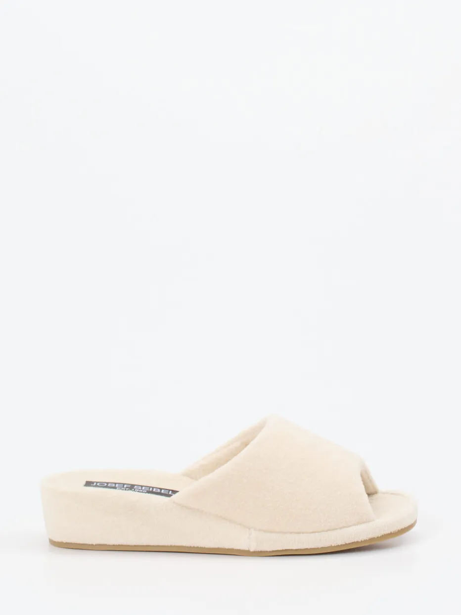 Flauschiges Lounge-Essential.Josef Seibel Relax präsentiert eine feminine Damen-Pantolette für behagliche Alltagsmomente. Das Modell aus besonders weichem Frottee-Textil in hellem Beige punktet mit flauschiger Haptik, offener Zehenpartie und leichtem Keilabsatz. Ton-in-Ton-Nähte und ein Label-Patch auf der Innensohle unterstreichen das zurückhaltende Design. Die rutschhemmende Gummisohle unterstützt sicheren Tritt, während das gepolsterte Fußbett für Komfort bei jedem Schritt sorgt. Inspiriert von Loungewear-Trends, passt der Look perfekt zu Kuschelsocken oder Hausanzug. Entspannter Stil mit funktionalem Komfort – typisch Josef Seibel.