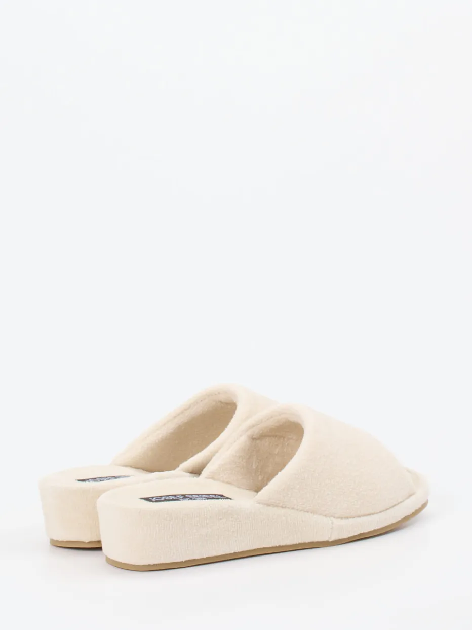 Diese Pantolette vereint flauschigen Frottee-Komfort mit femininer Keilsilhouette – ideal für entspannte Momente zu Hause.