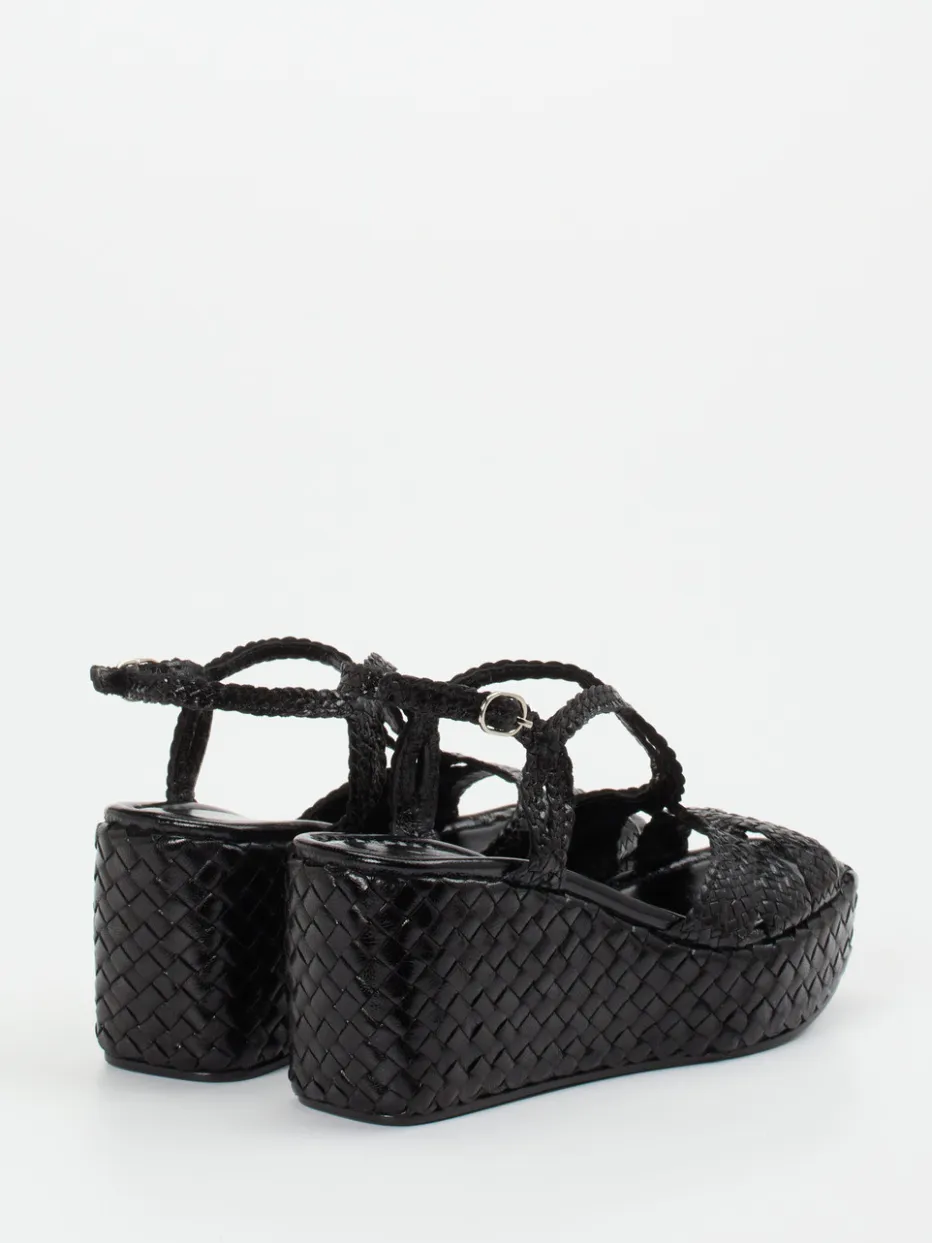 Die schwarze Keilsandalette von Pons Quintana verbindet handwerkliche Flechtoptik mit urbanem Chic. Ideal für sommerliche Looks mit mediterranem Touch.