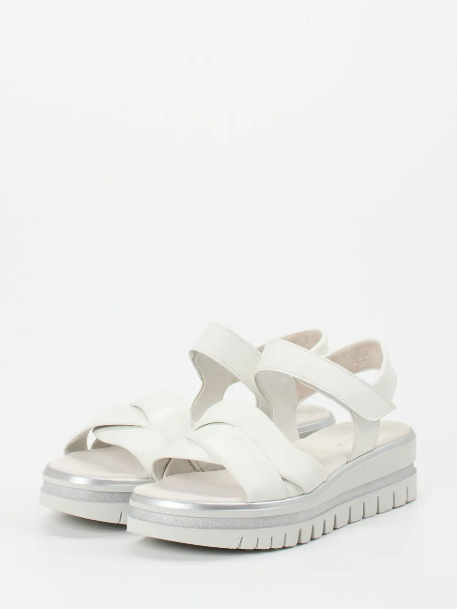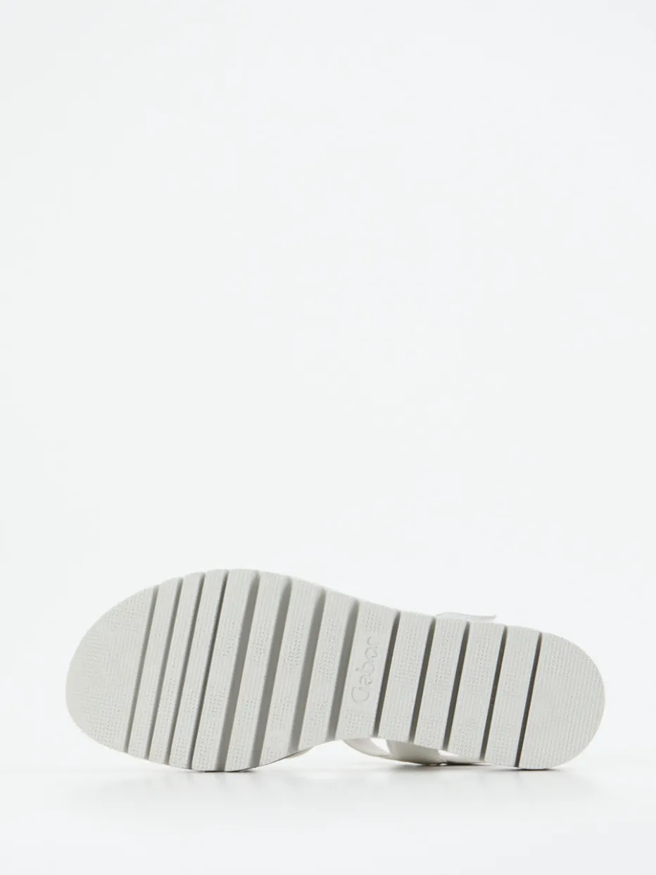 Minimalistisch trifft auf Metallic.Die Marke Gabor präsentiert mit dieser Keilsandalette aus weißem Lammleder eine stilvolle Option für Alltag und Urlaub. Weich verschlungene Riemen und ein regulierbarer Klettverschluss bieten individuellen Komfort. Das matte Leder kombiniert sich mit einer breiten, offengeführten Silhouette und silberfarbenem Zierstreifen an der profilierten Gummisohle – ein klares Bekenntnis zum Minimalismus-Trend mit Metallic-Akzent. Die gepolsterte Innensohle sorgt für angenehmen Tragekomfort, während die dezente Plateauoptik modernen Schwung verleiht. Ideal zu fließenden Stoffhosen oder urbanen Sommeroutfits. Gabor-Komfort in zeitlos-puristischem Design mit modischer Raffinesse.