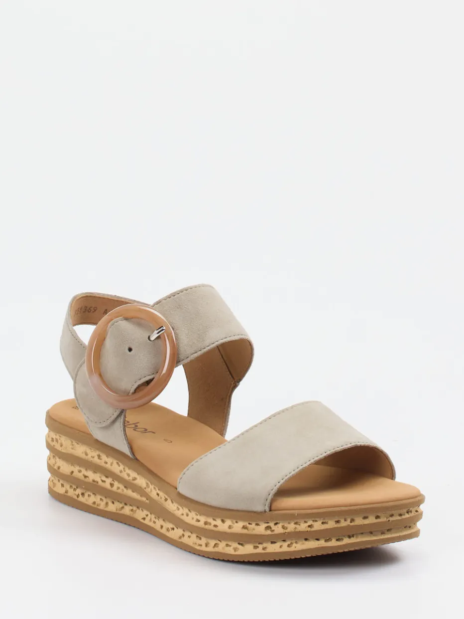 Sommerlicher Komfort mit stilvollem Akzent.Gabor präsentiert eine feminine Keilsandalette aus edlem Veloursleder in Schilfgrün. Ideal für Freizeit oder Urlaub überzeugt dieses Modell durch seine bequeme Passform und das weich gepolsterte Fußbett. Das samtig strukturierte Veloursleder verleiht eine matte Optik, während breite Riemen und eine dekorative Kunststoffschnalle in Hornoptik für einen charakterstarken Look sorgen. Der Keilabsatz mit braunbeiger Kork-Optik rundet das Design ab und bringt sommerliches Flair ins Outfit. Stilistisch bewegt sich die Sandale zwischen Retro-Einflüssen und minimalistischer Klarheit. Lässt sich mühelos zu Leinen-Styles oder Naturtönen kombinieren. Ein stilvoller Begleiter mit dem Komfortversprechen von Gabor.