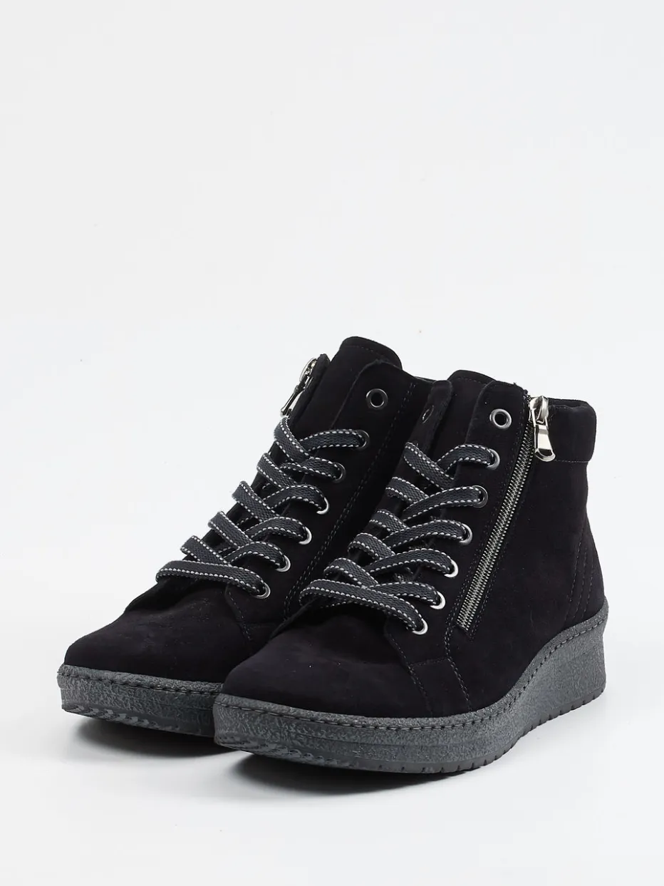Stilvoll durch kühle Tage.Die Marke Semler präsentiert mit diesen Keilsohlen-Boots ein herbsttaugliches Allround-Modell für Damen. Ideal bei wechselhaftem Wetter in der City oder auf entspannten Spaziergängen bietet dieser Schnürboot aus softem Veloursleder eine matte Oberfläche in tiefem Blau. Die Kombination aus Schnürung und seitlichem Reißverschluss erleichtert das Anziehen, während die profilierte Gummisohle mit dezentem Keilabsatz für Trittsicherheit sorgt. Silberfarbene Ösen und Kontrastnähte unterstreichen den cleanen Streetwear-Charakter. Die austauschbare Innensohle fördert den Komfort besonders für Einlagen, was vor allem bei längeren Strecken ein Pluspunkt ist. Kombiniert mit Jeans oder Thermoleggings wirkt der Look funktional und modern. Perfekt ausbalanciert zwischen Komfortanspruch und urbanem Anspruch.