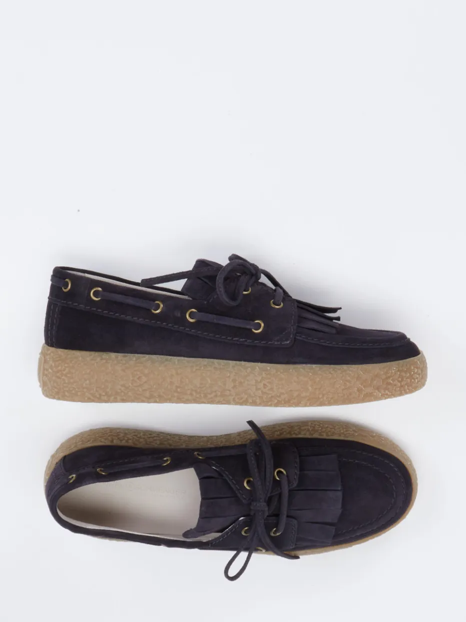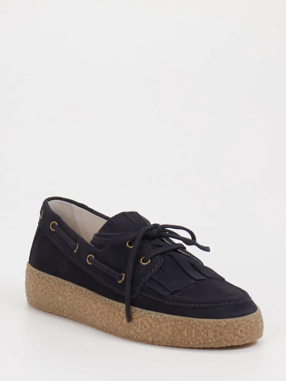 Herbstlicher Preppy-Charme in Dunkelblau. Kennel & Schmenger präsentiert mit diesem Damen-Bootsschuh einen edlen Freizeitbegleiter. Ideal für entspanntes Flanieren an der Promenade oder Freizeit-Ausflüge. Das dunkelblaue Veloursleder mit matter Oberfläche verleiht dem Modell eine luxuriös-zeitlose Note. Die schnürbare Fransenlasche, messingfarbene Ösen und eine strukturierte Gummisohle setzen modische Akzente, während das hellgraue Ziegenlederfutter für Komfort sorgt. Inspiriert vom Retro-Revival ist dieser Schuh ein stilistisches Highlight für Casual- und Preppy-Ensembles. Kombiniert mit Leinenhose und Canvas-Tasche entsteht ein sommerlich-urbaner Look. Tradition und Trendbewusstsein meisterhaft vereint – typisch Kennel & Schmenger.