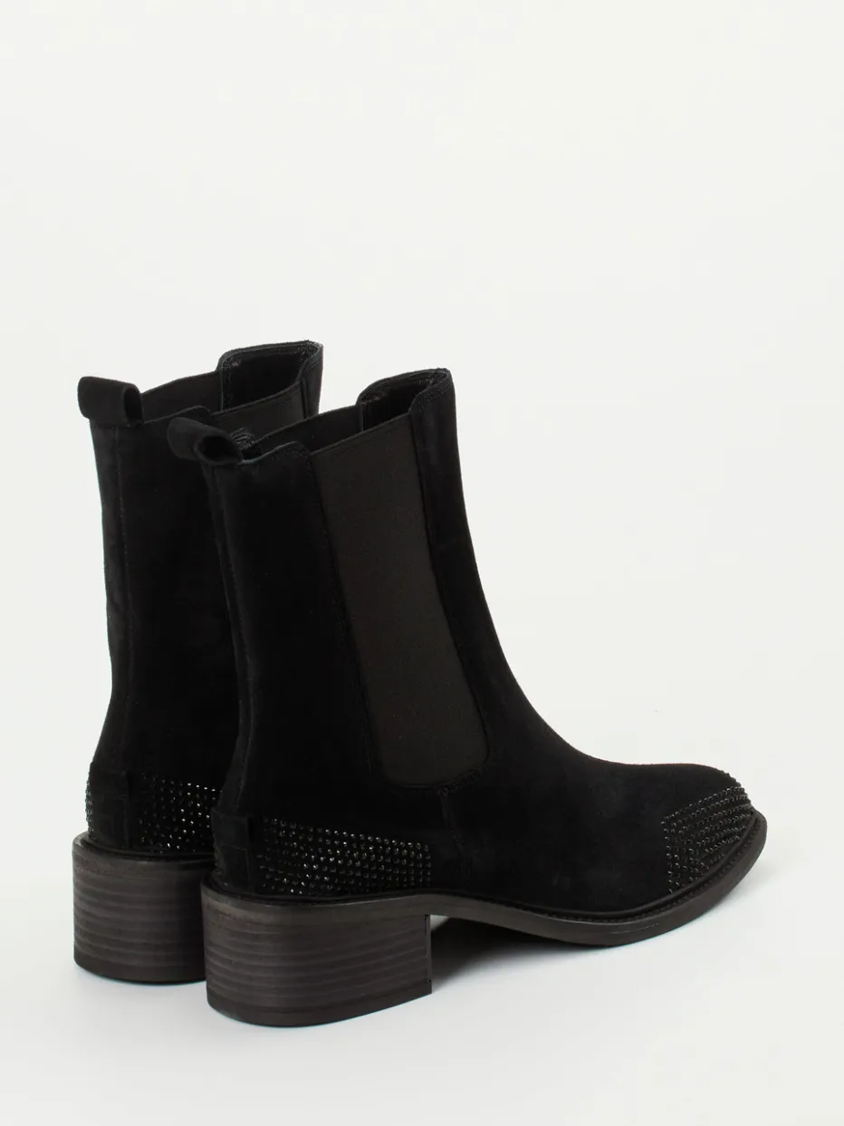 Diese Chelsea Boots vereinen samtiges Veloursleder mit dezenten Strassdetails – ein stilvoller Akzent für minimalistische Looks.