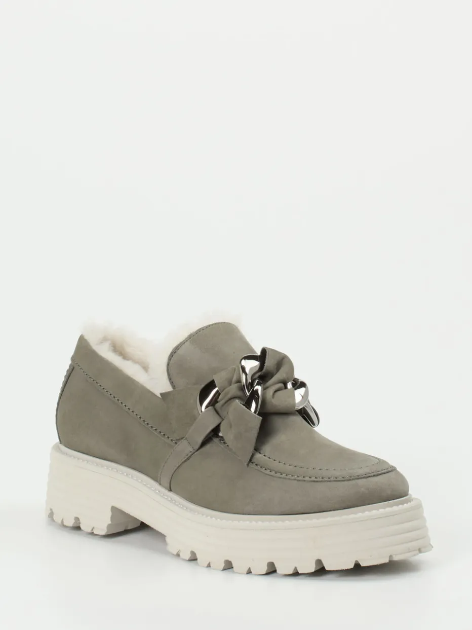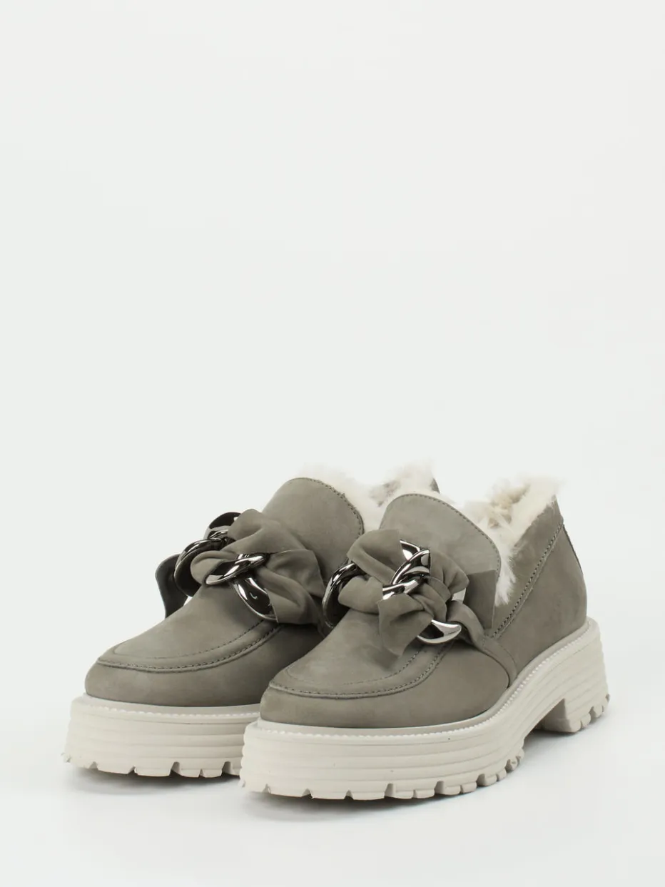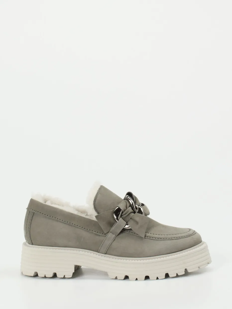 Chunky-Charme trifft Kuschellook.Kennel & Schmenger zeigt mit diesem Damen-Loafer eine moderne Interpretation des Klassikers. Für entspannte Tage mit Stilbewusstsein bietet sich der Slipper in steingrauem Nubukleder mit samtiger Textur an. Die klassisch gehaltene Form mit markanter Chunky-Sohle wird durch das silberfarbene Kettenelement mit Schleifendetail akzentuiert. Innen sorgt ein naturfarbenes, weiches Lammfellfutter für wohlige Wärme. Als Schlupfschuh konzipiert, ist er alltagstauglich, trendnah und ideal für den Cozy Core. Besonders gut zur Geltung kommt er kombiniert mit Naturtönen und Strick. Ein Statement-Loafer mit Komfortkompetenz und Urbanität.