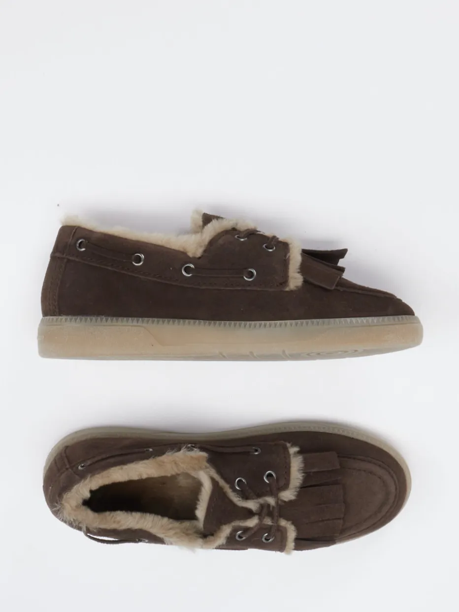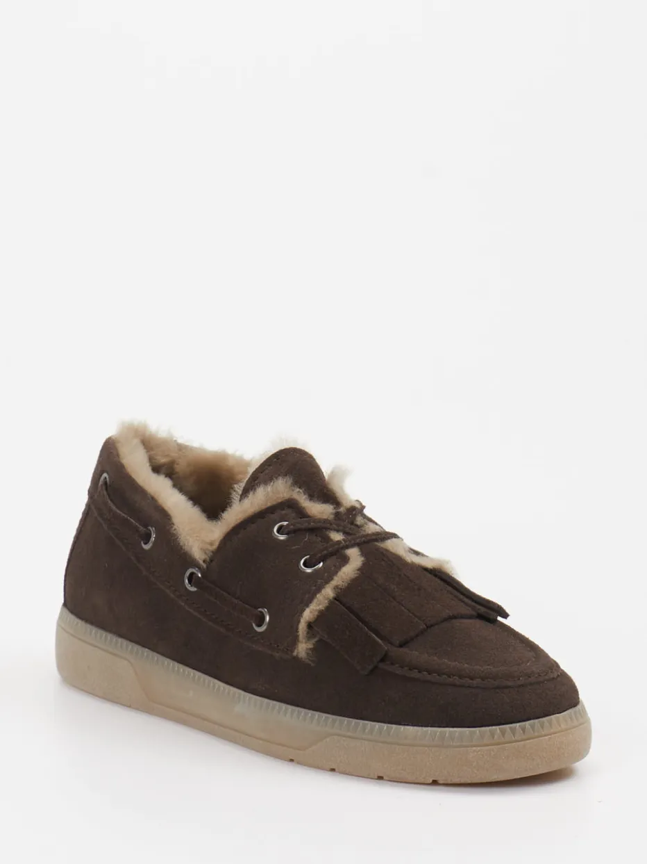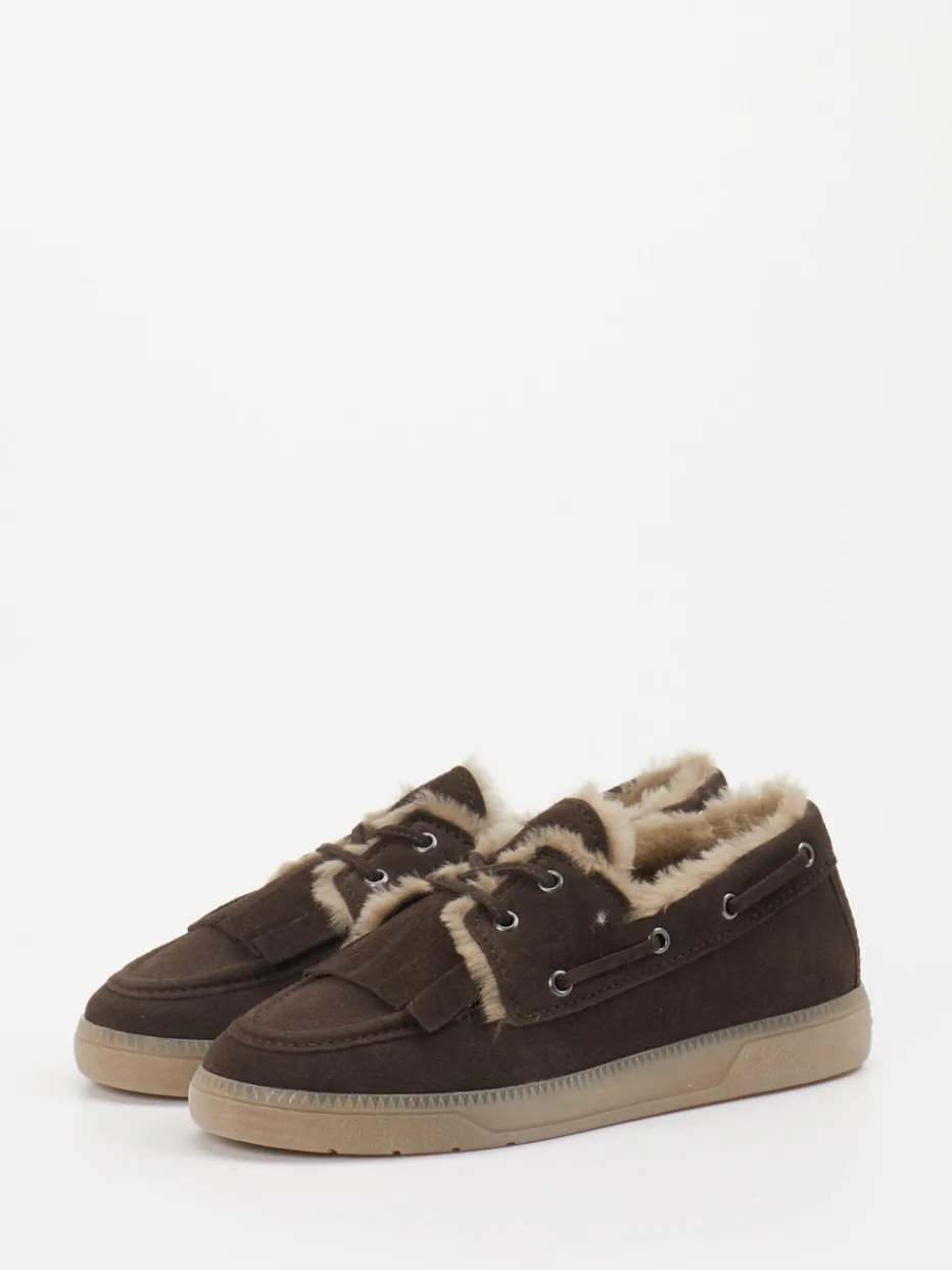 Ideal für ruhige Stunden zu Hause oder entspannte Ausflüge: Das braune Veloursleder sorgt in Kombination mit dem weichen Lammfellfutter für angenehme Wärme. Die klassische niedrige Silhouette und dekorative Fransen treffen auf eine rutschfeste Gummisohle und eine seitlich umlaufende Schnürung mit Metallösen. Das unifarbene Design in herbstlichem Dunkelbraun mit sandfarbenen Akzenten unterstreicht den Cozy-Trend mit Anleihen aus den 90ern. Besonders stimmig kombiniert mit Cordhosen oder Fleece-Hoodies.