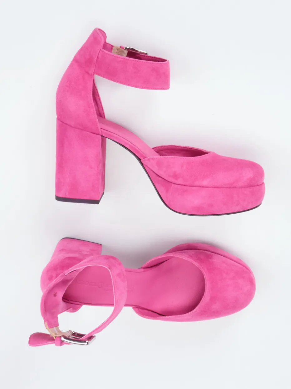 Mit ihrem kräftigen Pink, dem samtigen Veloursleder und dem markanten Blockabsatz interpretieren diese Pumps ein Party-Statement im Stil der 70er neu. Komfort und Stil wirken hier harmonisch zusammen.