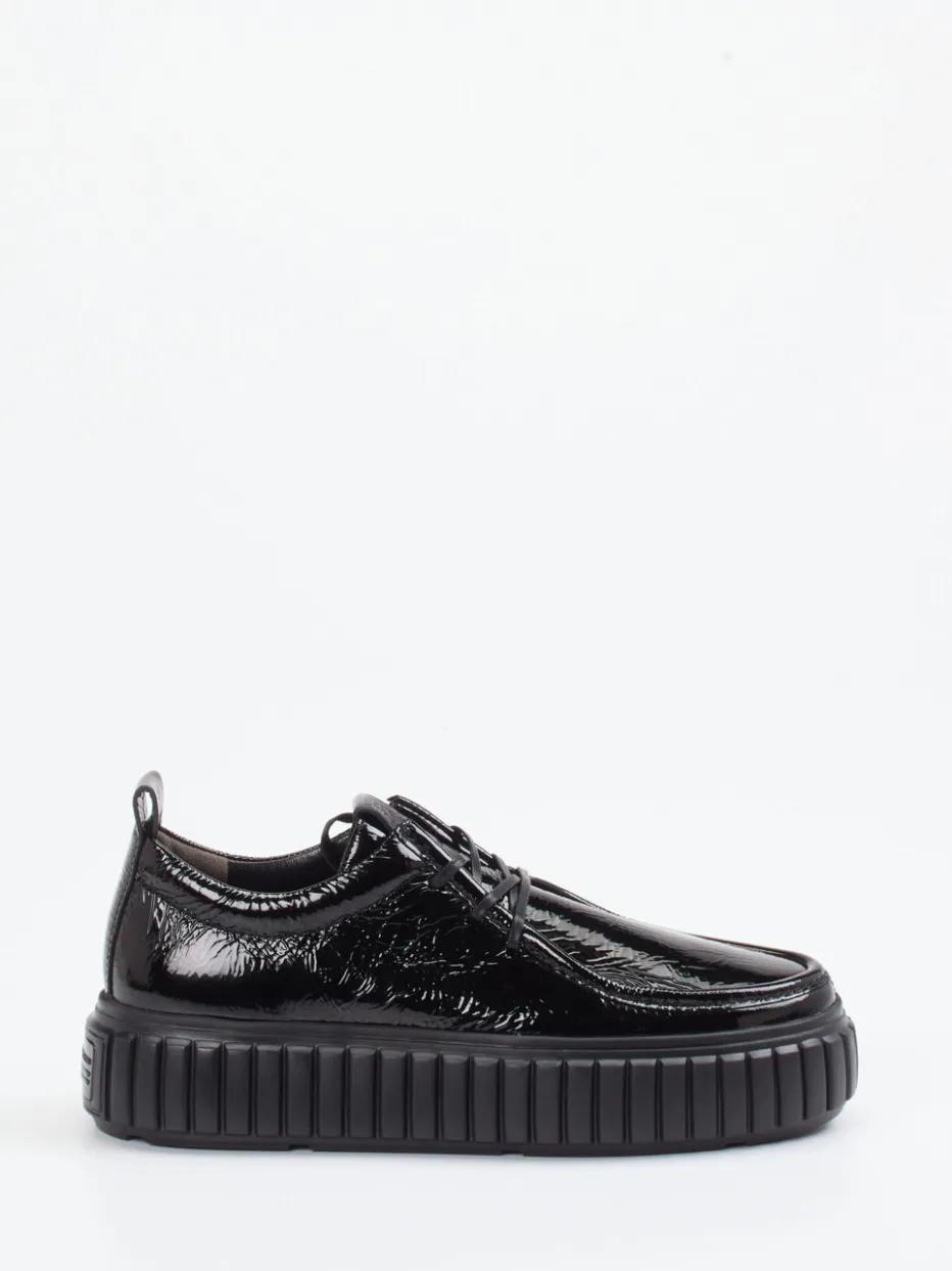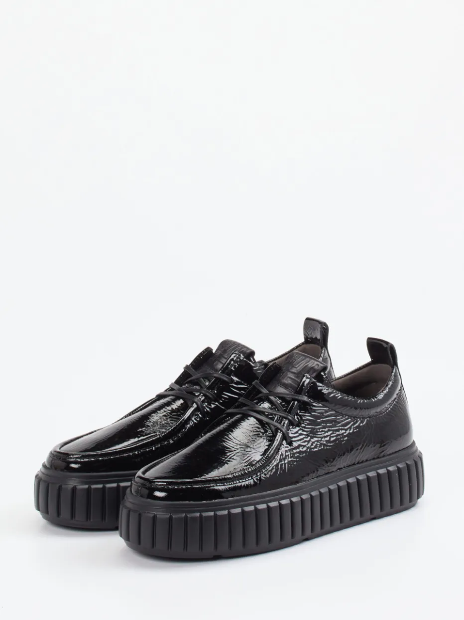 Der Damen-Halbschuh von Kennel & Schmenger ist ein markanter Plateau-Schnürschuh aus schwarzem Lackleder.