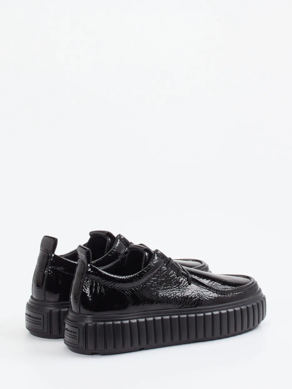 Ideal für urbane Freizeit-Outfits oder den modischen Auftritt am Abend: Die voluminöse Silhouette auf 4,5 cm hoher Chunky-Sohle bringt Modernität und Selbstbewusstsein auf den Punkt. Glänzend strukturiertes Lackleder, tonale Steppnähte und ein geprägtes Logo an Lasche und Ferse unterstreichen den minimalistischen Look. Die profilierte Gummisohle sorgt für Komfort und sicheren Halt. Ein ausdrucksstarkes Design mit Streetwear-Appeal, besonders gut kombinierbar mit Oversized-Schnitten und monochromen Styles.
