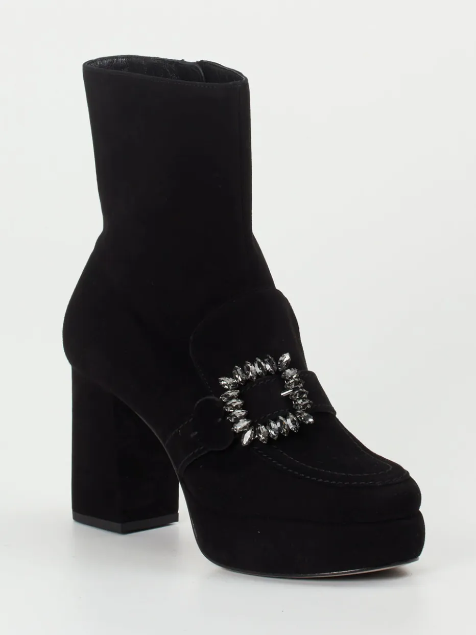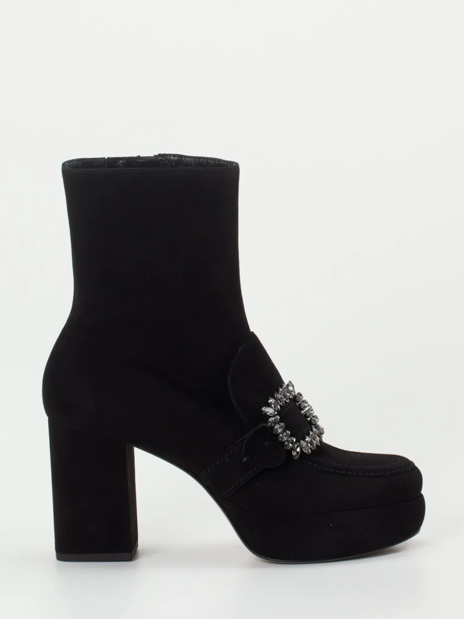 Mit samtigem Veloursleder und schimmernder Strassschnalle vereinen diese Plateau-Stiefeletten ausdrucksstarken Glamour mit komfortabler Höhe.