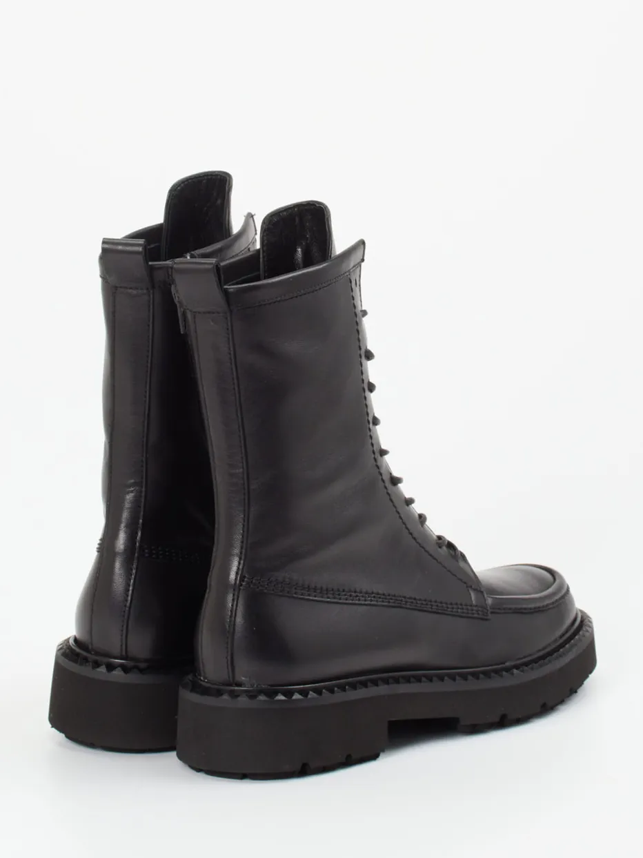 Diese kompakt geschnittenen Schnürboots überzeugen durch hochwertiges Kalbleder, funktionale Details und eine profilierte Sohle im Utility-Stil. Modernes Design trifft auf langlebige Verarbeitung.
