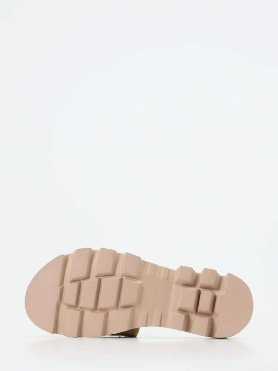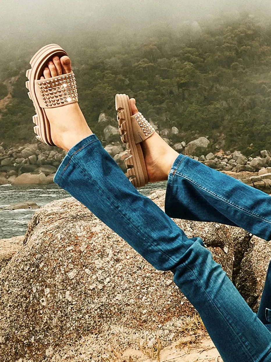 Sommer-Statement mit Glam-Faktor.Kennel & Schmenger präsentiert eine feminine Slide-Sandale für stilbewusste Sommertage. Ein gepolstertes Lederfußbett sorgt für Komfort – ideal für entspannte Urlaubstage oder Stadtspaziergänge. Das hellbraune Veloursleder vermittelt in Verbindung mit der sanft matten Oberfläche eine natürliche Eleganz, während die breiten Riemen mit gleichmäßig gefassten Strasssteinen modischen Glanz verströmen. Ihre offene Form, kombiniert mit der markant profilierten Chunky-Sohle aus Leichtzell, kombiniert Trendbewusstsein mit Trittsicherheit. Inspiriert von Streetwear und Minimalismus lässt sich dieses Modell vielseitig zu Sommerkleidern in Nude oder lässigen Shorts stylen. Modernes Design trifft auf komfortorientierte Fertigung mit stilistischer Handschrift.