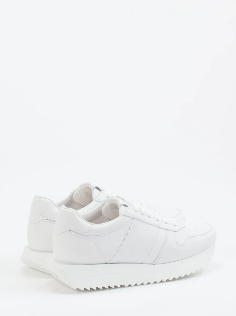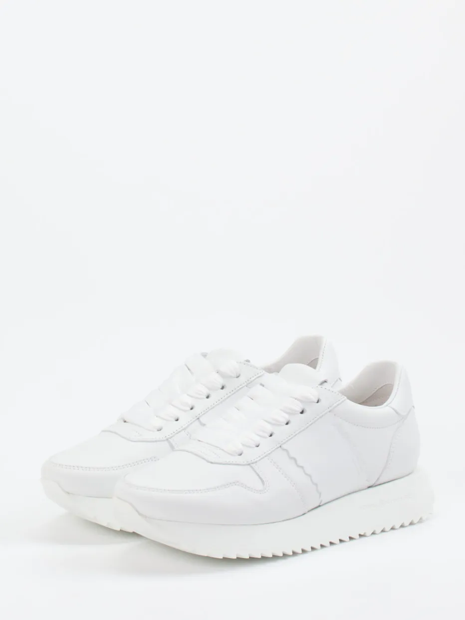 Vielseitiger Begleiter mit Stil.Kennel & Schmenger präsentiert einen Low-Top-Sneaker für Damen mit zeitloser Eleganz. Ideal für urbane Alltage, die ein stilvolles Auftreten erfordern. Das hochwertige weiße Lammleder zeigt sich matt mit Ton-in-Ton-Nähten und einem dezent geprägten Markenlogo. Die schmale Silhouette wird durch eine voluminöse Plateau-Gummisohle mit Haifischzahnprofil dynamisch ergänzt – funktional und modisch. Schnürung und weiches Ziegenlederfutter sorgen für Stabilität und Komfort. Monochrom gehalten, greift das Modell den „Quiet Luxury“-Trend auf. Lässt sich wirkungsvoll mit minimalistischen Business- oder Freizeit-Looks kombinieren. Kennel & Schmenger verbindet stilistische Zurückhaltung mit femininer Raffinesse.