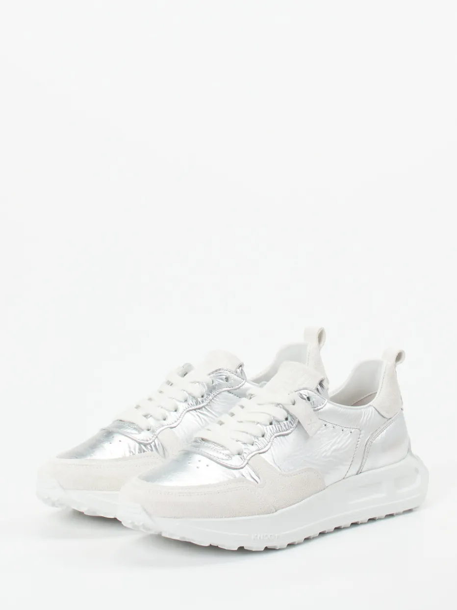 Silber trifft Komfort in futuristischer Form.Kennel & Schmenger präsentiert mit diesem Damen-Sneaker ein progressives Modell im Metallic-Look. Für urbane Momente mit modischem Anspruch bietet der Sneaker durch sein hochwertiges, silberfarbenes Metallicleder mit samtigem Veloursleder-Overlay eine besondere Materialtiefe. Der sportlich-voluminöse Schnitt mit gepolsterter Zunge, Ton-in-Ton-Schnürung und markanter Zuglasche steht ganz im Zeichen des Chunky-Sneaker-Trends. Die robuste, weiße Gummisohle mit dezentem Branding sorgt für Tragekomfort und ein sicheres Laufgefühl im Alltag oder beim Ausgehen. Streetwear-Einflüsse und eine klar strukturierte Silhouette machen das Design vielseitig kombinierbar – etwa mit weißen Oversized-Jacken. Ein progressiver Alltagsbegleiter mit trendigem Metallic-Finish und komfortabler Ausstattung.