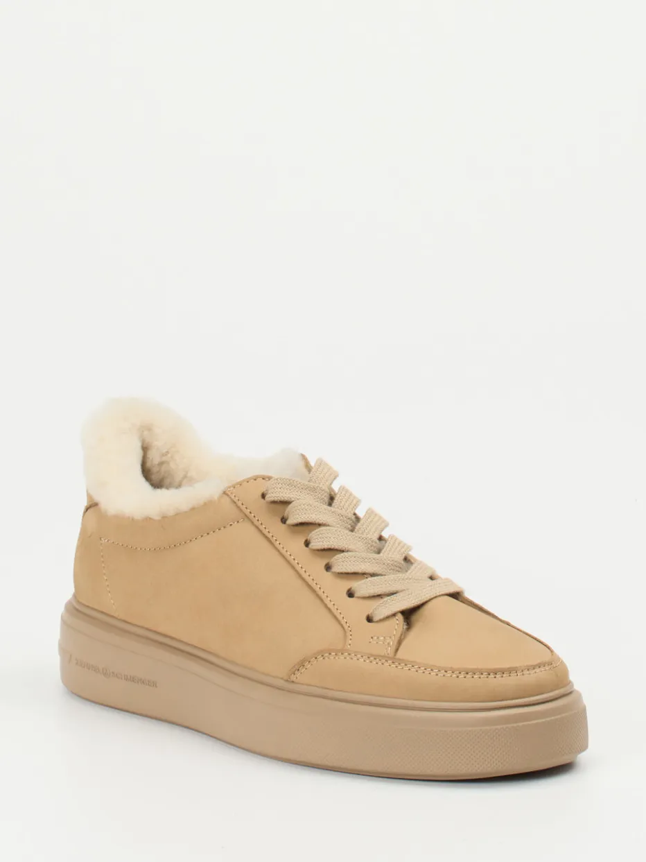 Ob beim Stadtspaziergang oder im entspannten Freizeitlook – dieses Modell verbindet Komfort und Stil. Die matte Oberfläche, das kuschelig natürliche Lammfellfutter und die tonige Plateausohle mit eingeprägtem Branding verleihen dem Low-Top-Sneaker eine ruhige, hochwertige Ausstrahlung. Seine klassische Form mit runder Silhouette und feinen Steppnähten macht ihn zu einem vielseitigen Begleiter für Cozy-Core-Looks. Ideal zu grob gestrickten Pullovern oder beigen Wollmänteln.