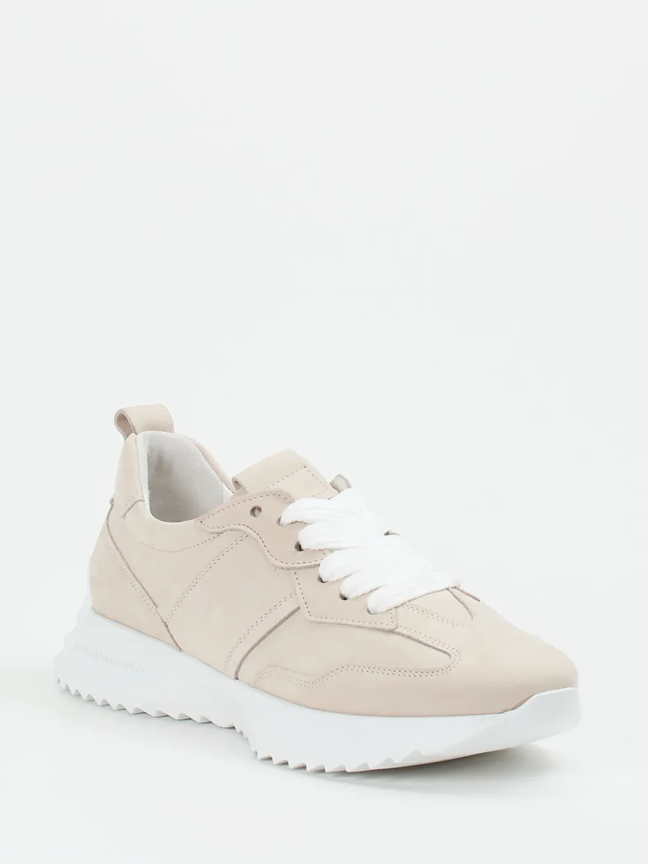Ideal für den modernen Alltag, überzeugt dieses Modell durch seine samtig angeschliffene Nubukleder-Oberfläche und ein sportlich-dynamisches Design. Die dominante Sandbeige-Farbgebung unterstreicht den minimalistischen Charakter, während breite weiße Schnürbänder und eine auffällige Chunky-Profilsohle kontrastreiche Akzente setzen. Geprägtes Branding und eine rückseitige Zuglasche vervollständigen den Look. Das angenehm gepolsterte Ziegenlederfutter und die Einlagenfreundlichkeit bieten hohen Tragekomfort. Stilistisch ist der Sneaker dem Quiet-Luxury-Trend zuzuordnen.