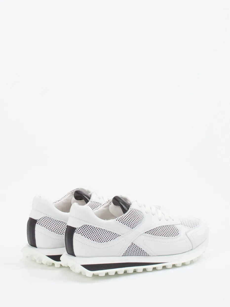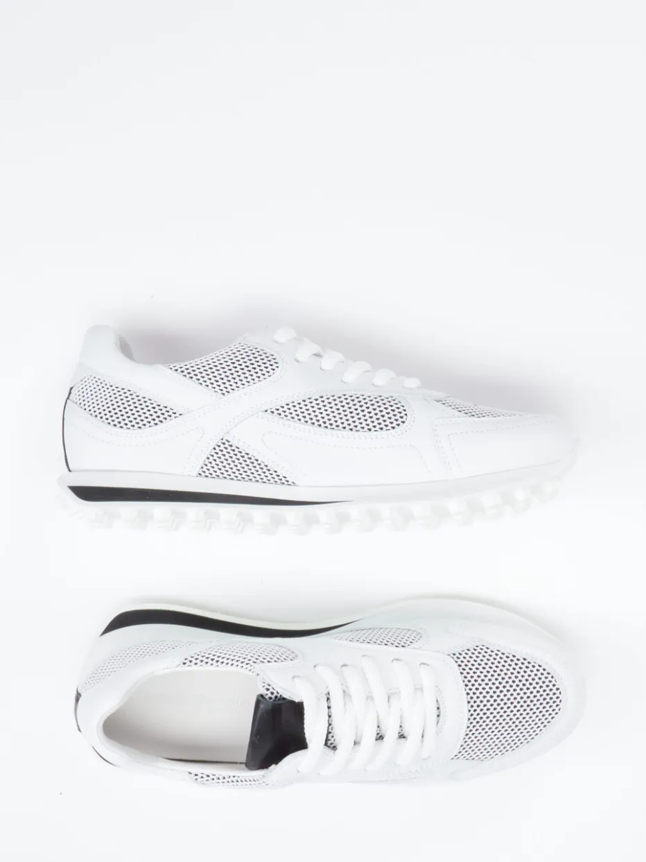 Technisches Mesh trifft Retro-Attitüde.Kennel & Schmenger bringt mit diesem Unisex-Sneaker im Retro-Runner-Stil ein angesagtes Modell auf die Straße. Ideal für aktive Tage in der Stadt bietet der weiße Sneaker atmungsaktives Textilmaterial mit perforierten Mesh-Zonen und glattem Velourleder. Schwarz akzentuierte Details an Zunge und Ferse setzen stilvolle Kontraste. Die sportlich-flache Silhouette sowie die griffig profilierte Gummisohle liefern Komfort und Stabilität – ob im Alltag oder auf spontanen Wegen. Modisch verortet im Tech-Mesh-Trend überzeugt das Modell als stilistisches Highlight zu Jogpants oder urbaner Freizeitkleidung. Ein sportlich-eleganter Sneaker mit Kennel-&-Schmenger-Typizität für anspruchsvolle Styles.