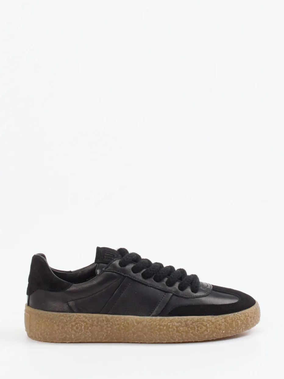 Ideal für entspannte City-Tage vereint dieser Low-Top Sneaker ein samtig angeschliffenes Veloursleder mit glattem Leder in klassischem Schwarz. Die strukturierte, karamellfarbene Gummisohle verleiht dem Schuh Retro-Charakter, der dank klarer Linien und Ton-in-Ton-Schnürung auch minimalistisch wirkt. Ein geprägtes Zungenlogo, Lammfellfutter und auffällige Schnürbänder unterstreichen den hohen Komfort. Passt zu Oversize-Coats und Denim in Naturtönen.