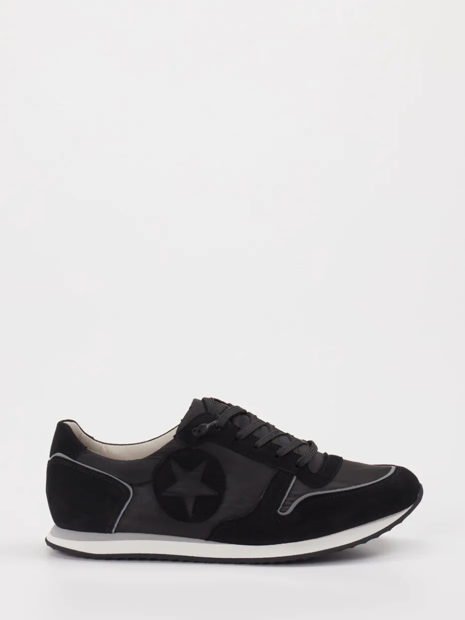 Monochromer Stil, moderner Komfort. Kennel & Schmenger präsentiert einen Damen-Sneaker im Retro-Runner-Stil, der sportliche Eleganz mit subtilen Details vereint. Ob für einen Stadtbummel oder entspannte Stunden zu Hause – das Modell aus mattem Veloursleder und Textil überzeugt durch seinen monochrom-schwarzen Look mit tonaler Stern-Applikation und reflektierenden Paspeln. Die schlanke Silhouette, eine komfortable Polsterung und die griffige Gummisohle bieten einen urbanen Mix aus Style und Funktionalität. Inspiriert von Streetwear und „Quiet Luxury“-Trends passt der Sneaker optimal zu cleanen Outfits oder lässigen Basics. Markentypischer Anspruch an Design und Passform geben diesem Sneaker seinen besonderen Alltagswert.