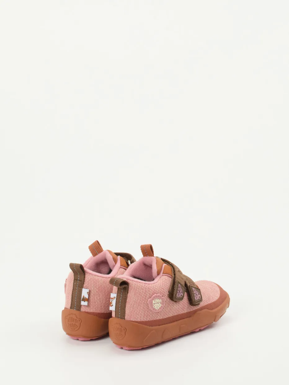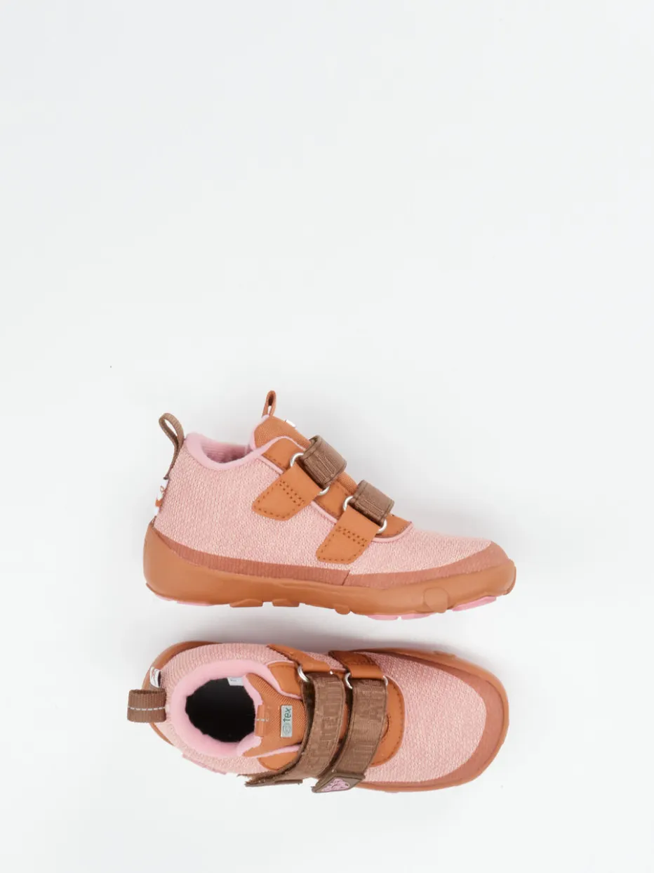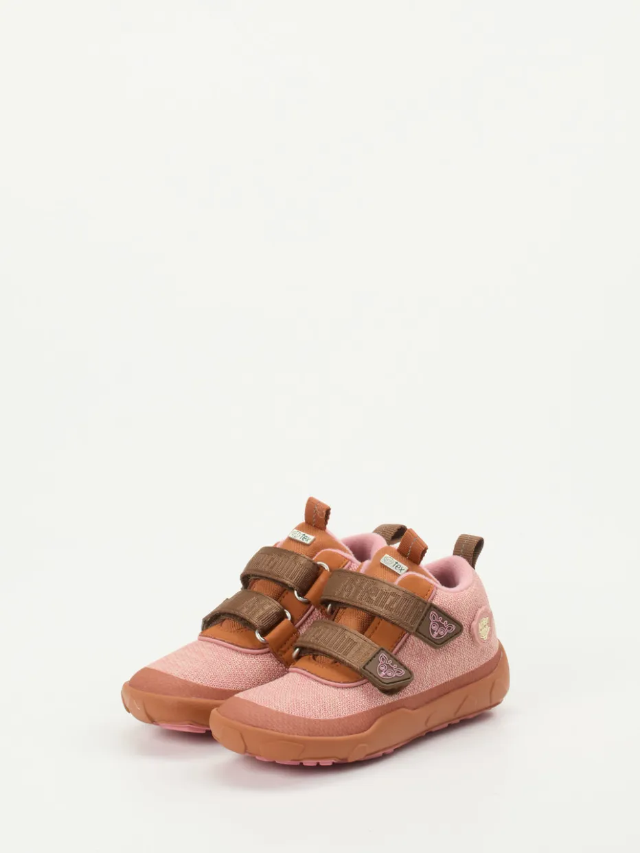 Ideal für Bewegung im Freien oder den Alltag im Kindergarten: Das wetterfeste, recycelte Textilmaterial mit leicht strukturierter Oberfläche sorgt für angenehmen Tragekomfort und passt sich dem Kinderfuß optimal an. Die Kombination aus Altrosa, Mittelbraun und Hellrosa greift den aktuellen Color-Blocking-Trend auf. Dank zweifacher Klettverschlüsse mit liebevollen Reh-Details gelingt das An- und Ausziehen kinderleicht. Die flexible Gummisohle bietet sicheren Halt und unterstützt natürliches Abrollen – barfußähnliches Gehen inklusive. Perfekt zu Softshelljacke und Mini-Rucksack kombinierbar.