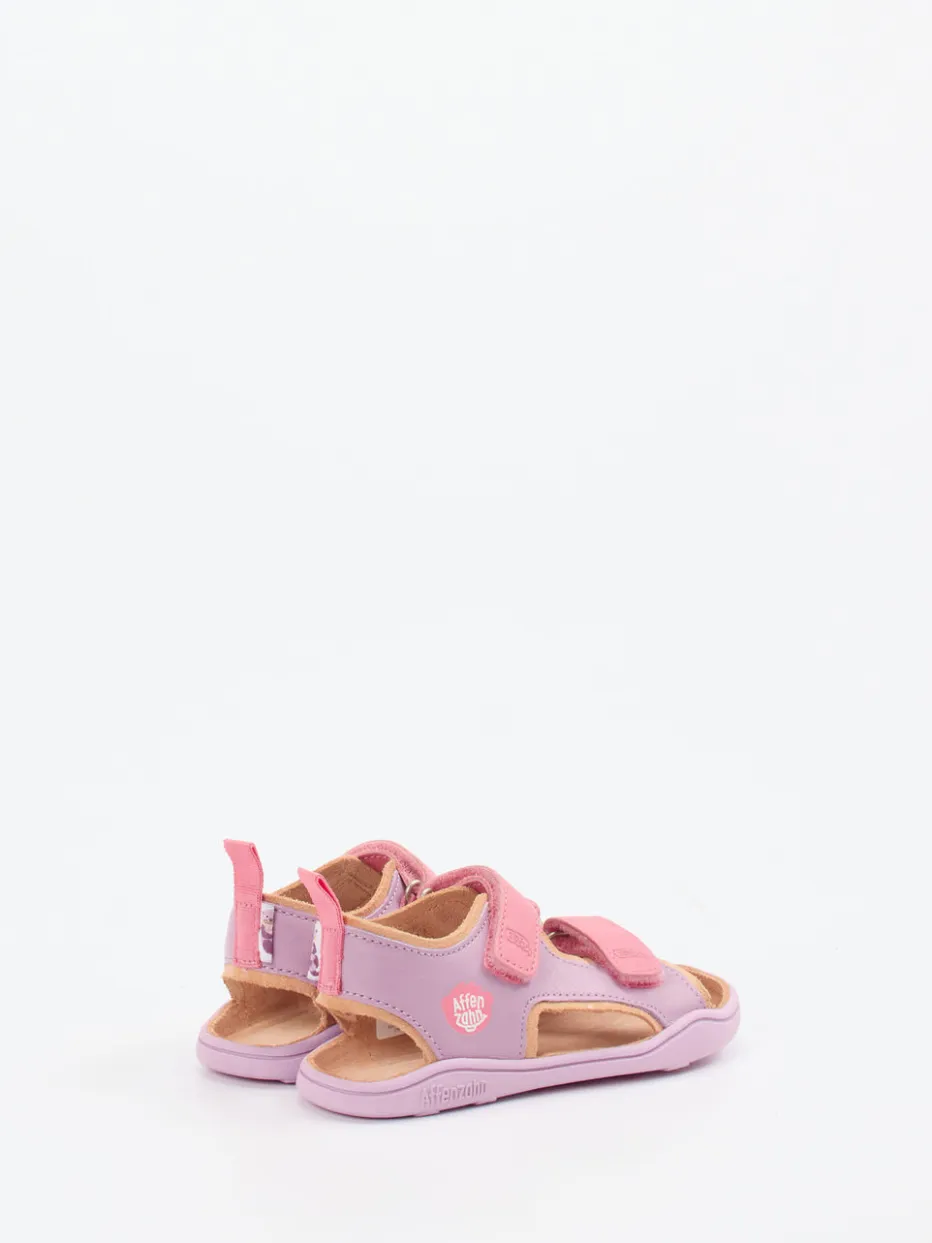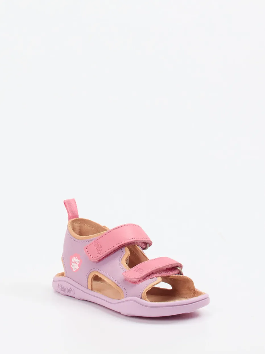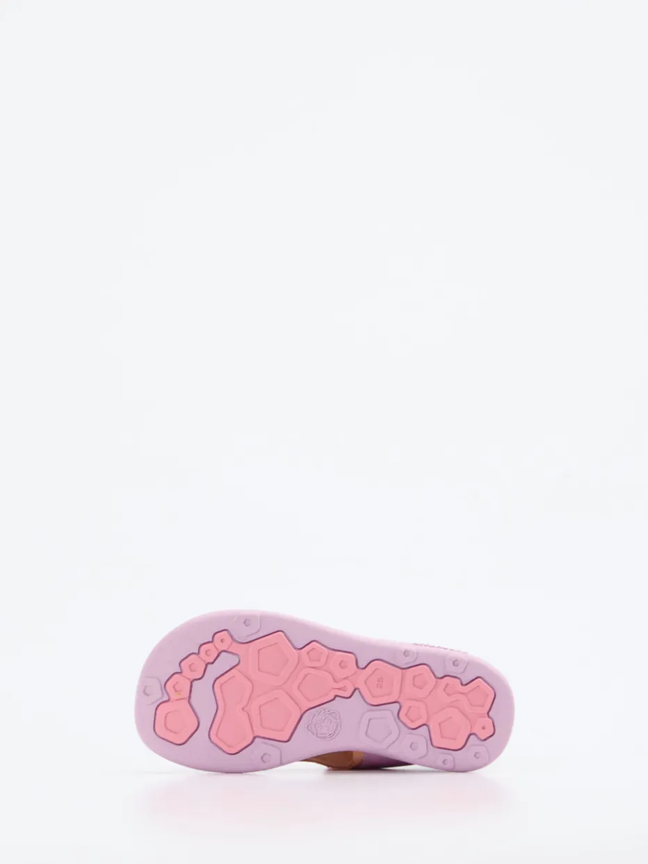Ob beim Spielen im Park oder beim Strandspaziergang – der offene Schnitt mit sicherem Fersenhalt bietet angenehme Bewegungsfreiheit. Das samtig-matte Kalbleder trifft auf fliederfarbene Akzente und rosa Details, ergänzt durch Ton-in-Ton-Nähte und ein dezent geprägtes Markenlogo. Drei Klettverschlüsse und eine praktische Textilzuglasche erleichtern das An- und Ausziehen. Die strukturierte Gummisohle unterstützt ein natürliches Laufgefühl und passt perfekt zum angesagten Pastelltrend der Saison. Funktional, minimalistisch und alltagstauglich – kombinierbar mit Shorts und Sonnenhut.