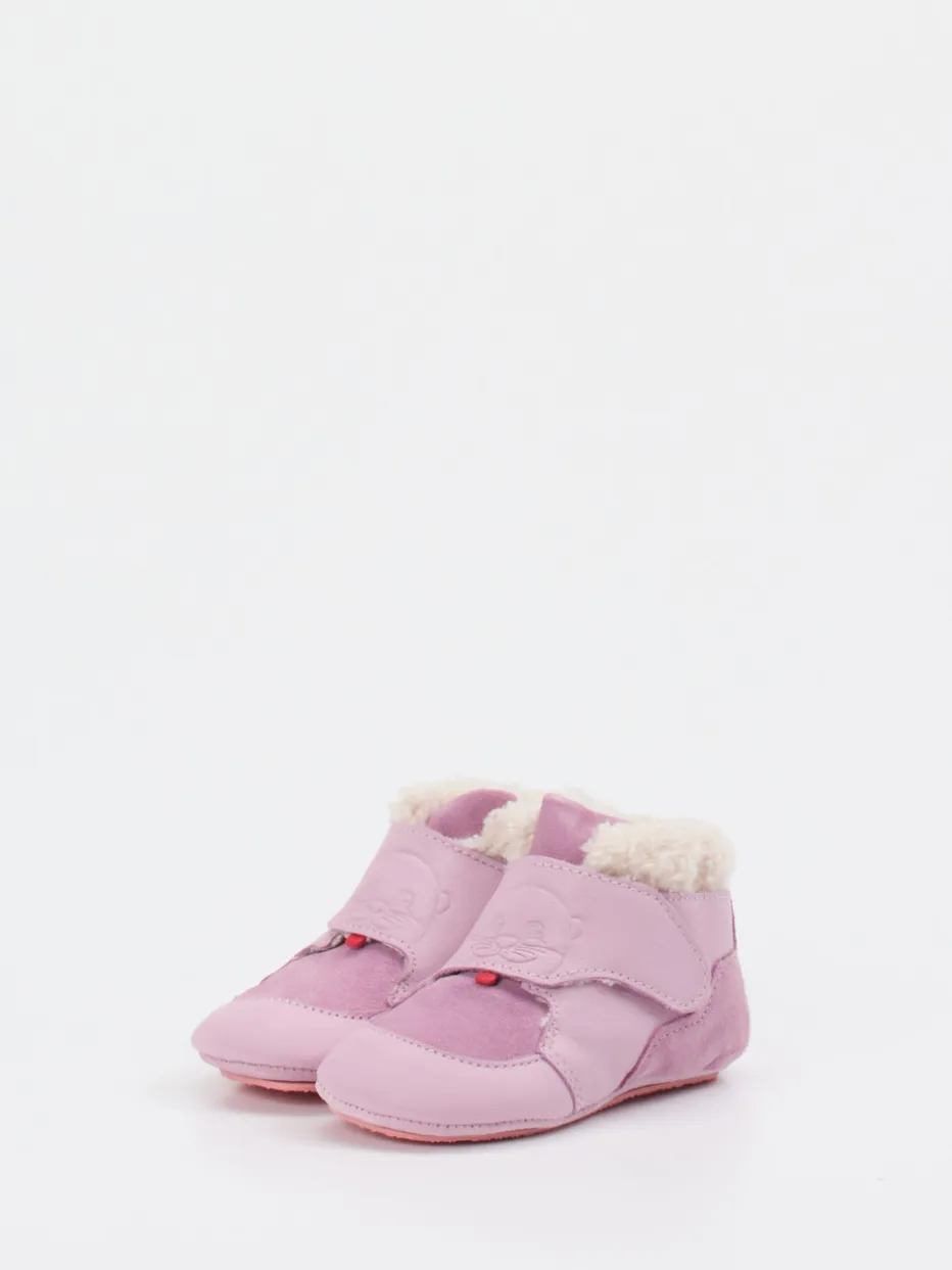 Für kleine Schritte mit Stil.Affenzahn präsentiert mit diesen Krabbelschuhen eine kindgerechte Lösung für warme Füße im Alltag. An kühlen Tagen im Spielzimmer bieten die knöchelhohen Lauflernschuhe Sicherheit und Geborgenheit. Das hochwertige Kalbleder zeigt sich außen samtig-matt in pastelligem Rosa und wurde um geprägte Tiergesichter und ein farbiges Nasendetail ergänzt. Für wohlige Wärme sorgt das kuschelige Teddyfutter aus Textilfaser. Dank Klettverschluss lassen sich die Schuhe mühelos anziehen, während die strukturierte Gummisohle rutschhemmende Stabilität gewährleistet. Der Look passt zur Quiet-Luxury-Trendwelt der Winterkindermode 2024. Affenzahn steht für Komfort, spielerisches Design und durchdachte Funktion – ideal im Familienalltag.