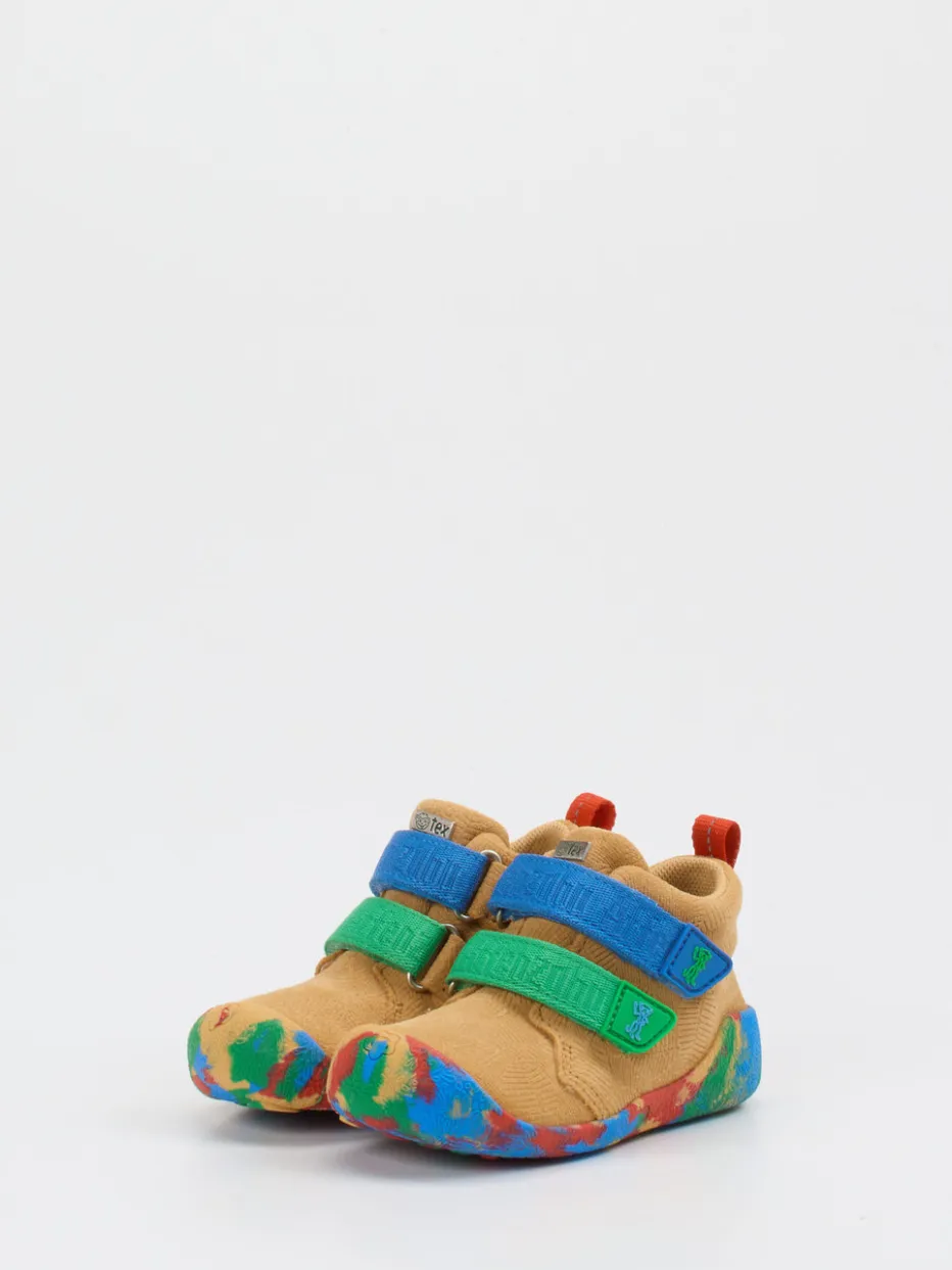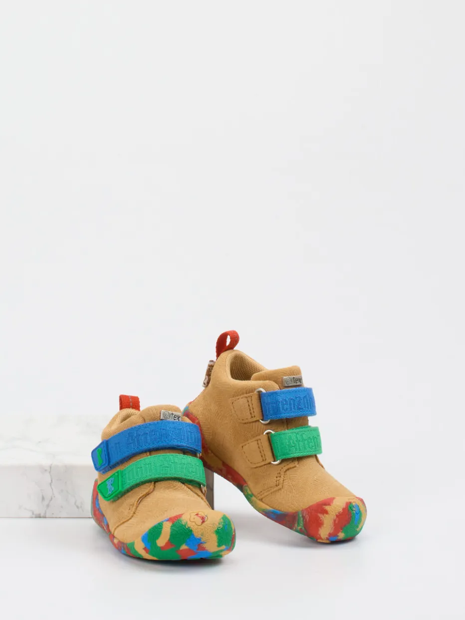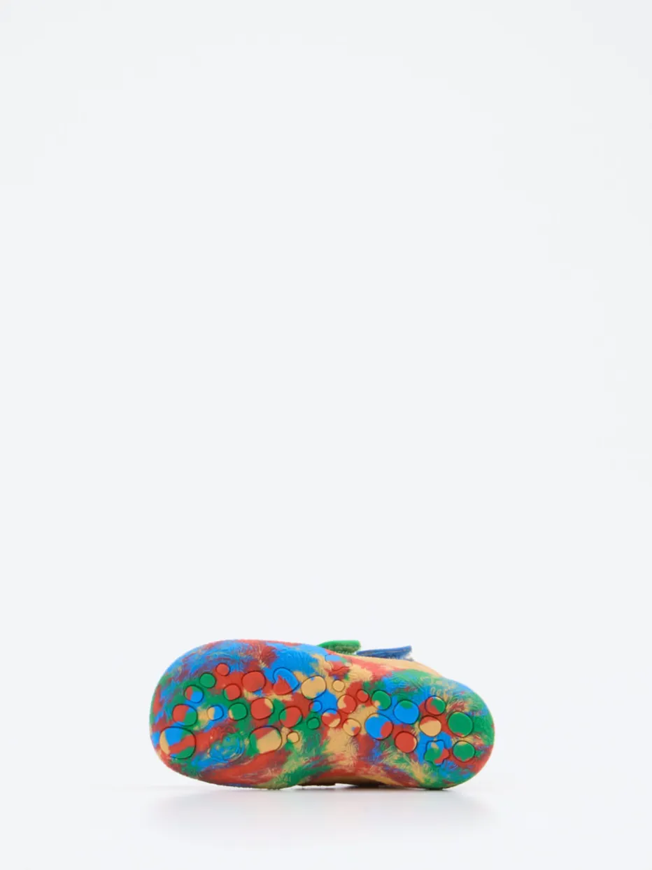 Ob drinnen oder draußen – das strukturierte Veloursleder sorgt für ein angenehm weiches Tragegefühl, während die farbenfrohe Gummisohle mit Farbklecks-Optik sicheren Halt bietet. Die kompakte, runde Form, kombiniert mit doppeltem Klettverschluss und rückseitiger Zuglasche, unterstützt kleine Füße optimal bei jedem Schritt. In Sandbeige mit Akzenten in Kobaltblau und Grasgrün harmonieren sie perfekt mit verspielter Kinderkleidung. Der Look greift das Color-Blocking-Trendthema auf – ideal für Freizeit und Entdeckungstouren.