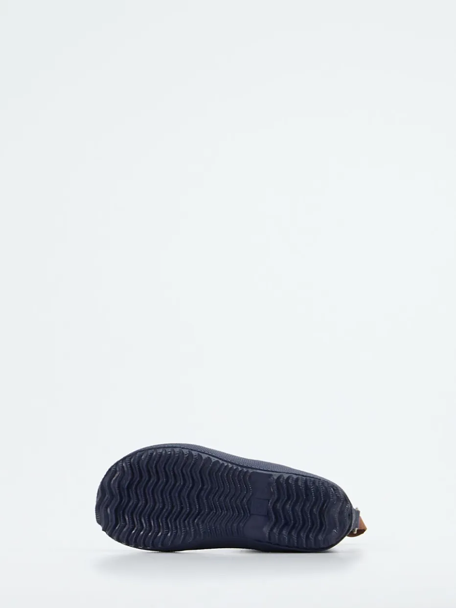 Ideal für regennasse Wege im Kindergartenalltag oder auf dem Spielplatz. Das dunkelblaue Synthetikmaterial zeigt sich wetterfest und mit matter Oberfläche. Der Einstieg gelingt dank seitlicher Elastikeinsätze und cognacfarbener Lederzuglasche leicht. Die profilierte Gummisohle mit tiefem Zickzack-Muster sorgt für sicheren Halt auf rutschigen Böden. Innen schützt ein graumeliertes Textilfutter vor Kälte und Feuchtigkeit. Stilistisch wirkt das Design klar, funktional und skandinavisch inspiriert. Kombiniert zu Regenjacke und warmen Leggings entsteht ein praktischer Look.