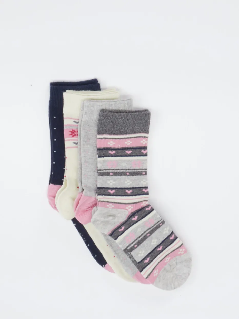 Vier Paar weich gestrickte Damen-Crew-Socken von Camano bieten mit winterlich inspiriertem Design und elastischem Komfort einen stilvollen Begleiter für entspannte Stunden.