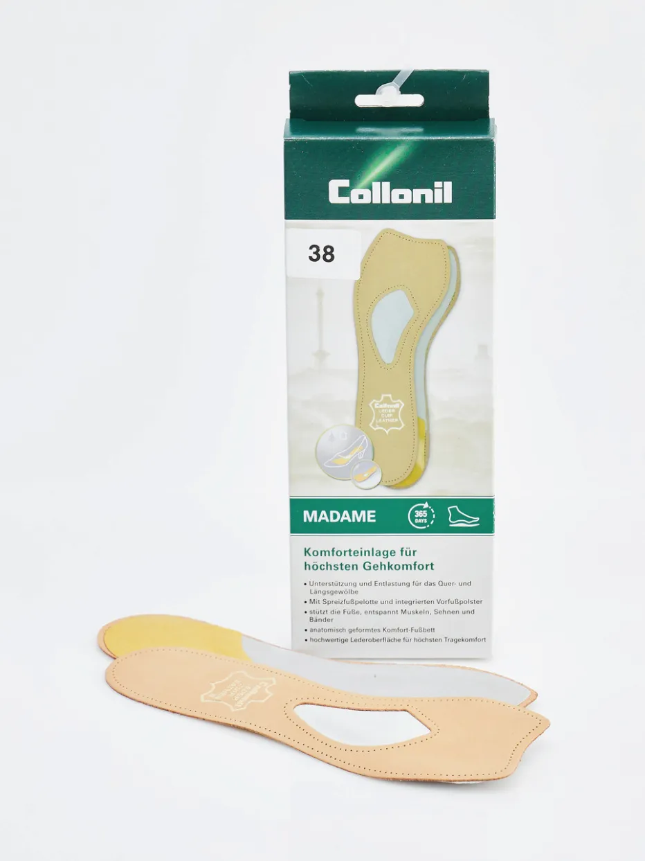 Diese Einlage der Marke Collonil besteht aus pflanzlich gegerbtem Leder und enthält ein Schaumstoffpolster sowie eine praktische Klebefixierung. Sie sorgt für eine spürbare Unterstützung und Entlastung des Quer- und Längsgewölbes des Fußes. Aus hygienischen Gründen ist der Umtausch ausgeschlossen.