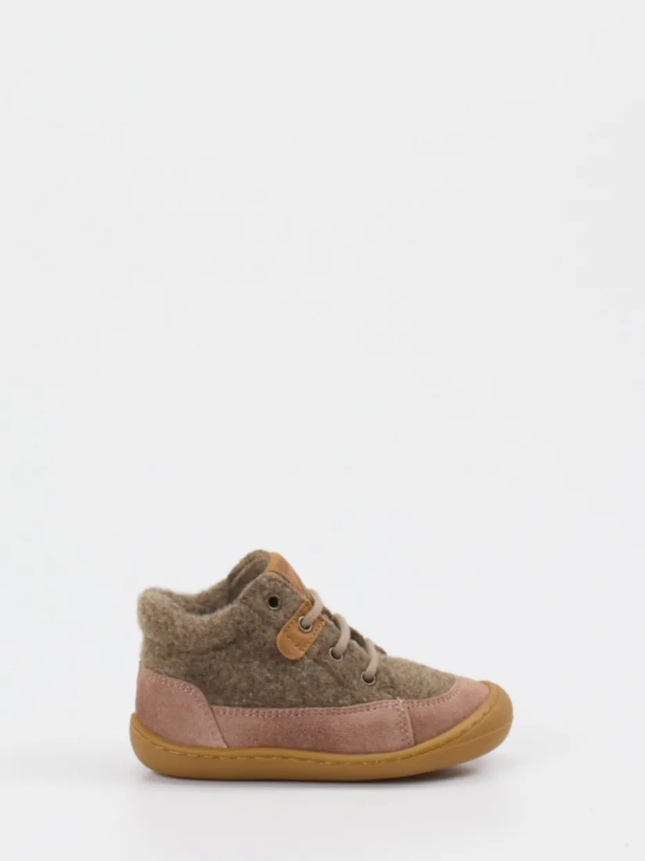 Natürlich warm und kindgerecht gestaltet.Der develab-Lauflernschuh überzeugt mit klassischer Schnürung und kuscheligem Wollfutter. Für erste Ausflüge im Herbst bietet dieser Schuh ein weiches Fußbett und stabile Rundform. Gefertigt aus Veloursleder mit samtiger Oberfläche und ergänzendem Wollfilz, zeigt er sich in einem harmonischen Mix aus Beigebraun, Altrosa und Honigbraun. Die flexible Gummisohle und die verstärkte Zehenkappe unterstützen sicheren Stand und Bewegungsfreiheit. Logos auf der Zunge und am seitlichen Patch setzen dezente Markenakzente. Inspiriert von Scandi Kidswear, bestens kombinierbar zu Wollwalk-Overalls. develab bietet funktionalen Komfort mit klarer Naturästhetik.