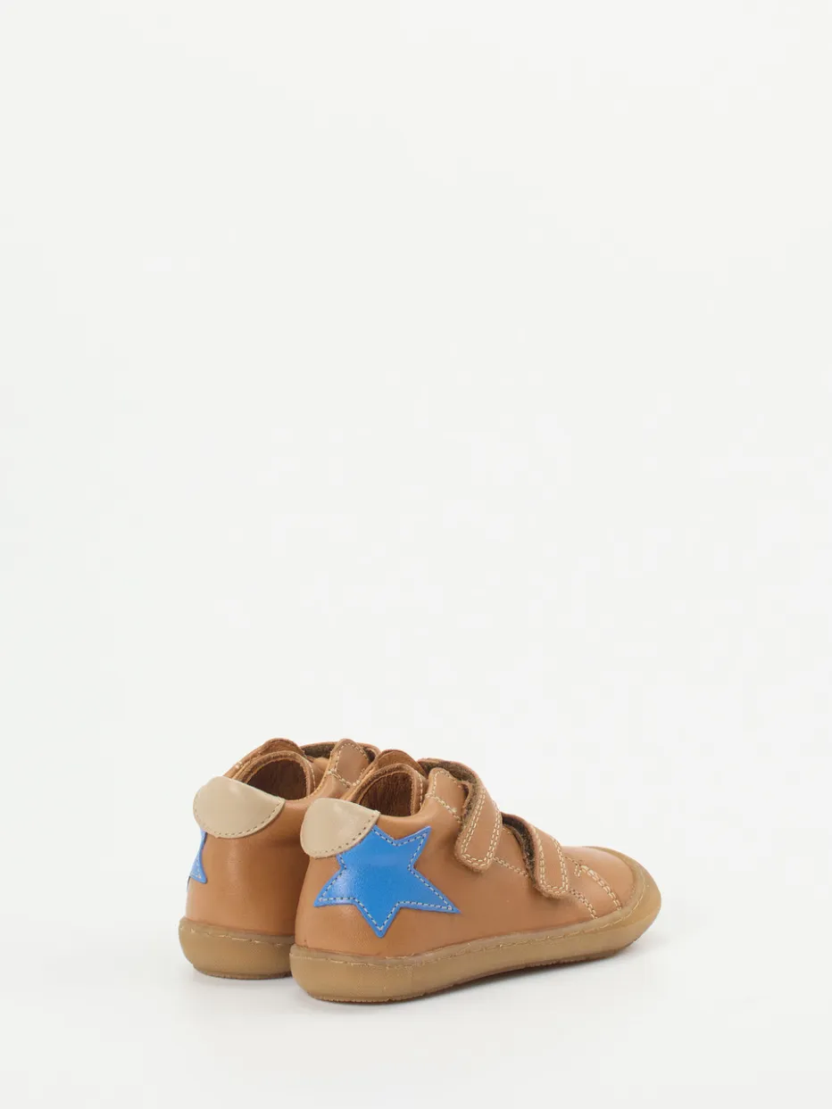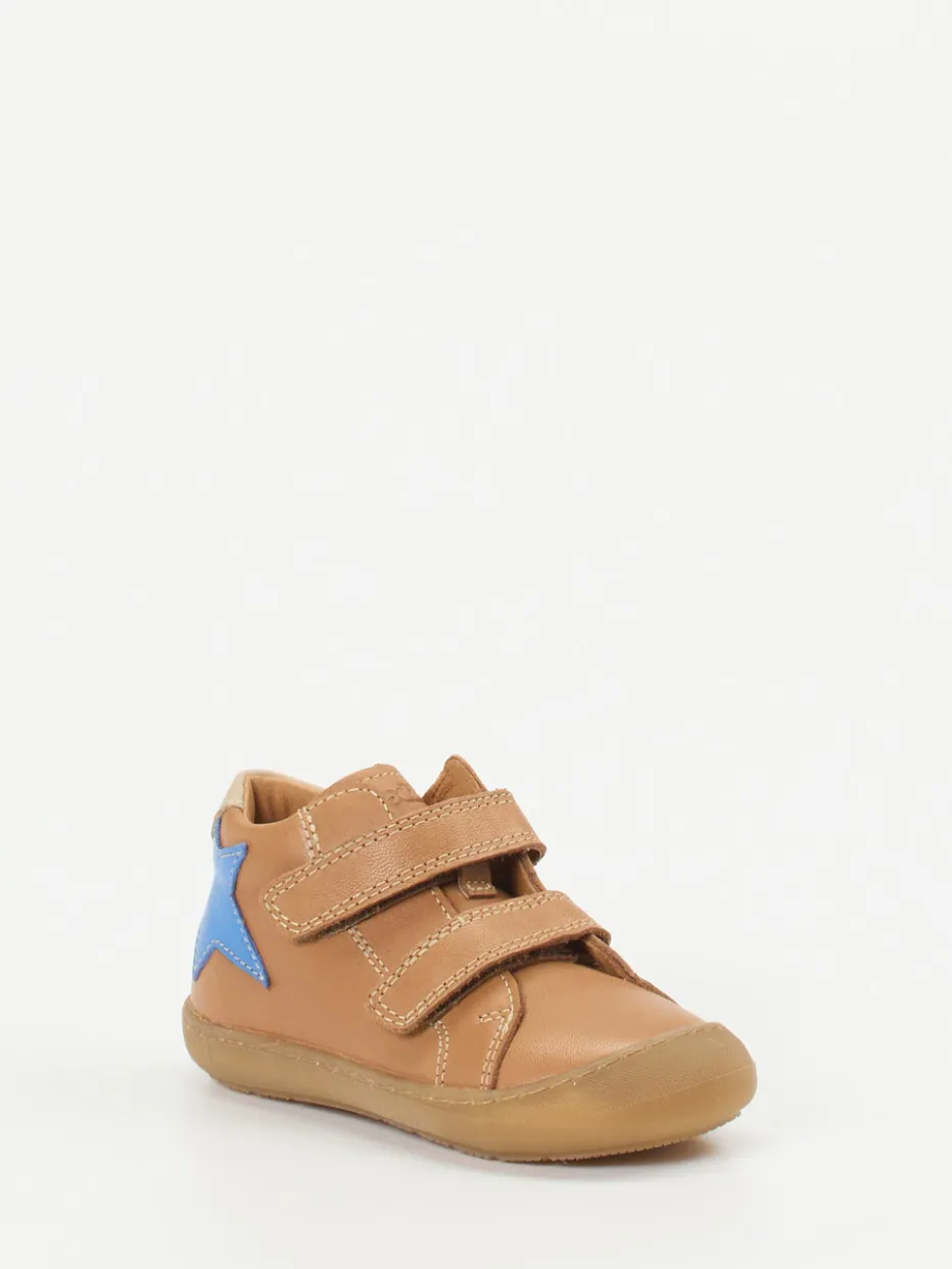 Stabiles Laufen lernen mit Stil.Die Marke Froddo präsentiert einen durchdachten Lauflernschuh für kleine Entdeckerinnen und Entdecker. Ideal für Kita und Alltagsabenteuer: Das hellbraune Kalbleder wirkt matt und wurde aufwendig mit sichtbaren Kontrastnähten sowie einer markanten Stern-Applikation in Kornblumenblau veredelt. Dank gepolstertem Einstieg und zwei praktischen Klettverschlüssen lässt sich der knöchelhohe Schuh leicht anziehen. Die profilierte Gummisohle unterstützt erste Schritte mit sicheren Tritten auf unterschiedlichen Untergründen. Inspiriert vom skandinavischen Minimalismus, passt das Design besonders gut zu lässigen Looks. Froddo steht für kindgerechte Qualität mit durchdachter Funktionalität.