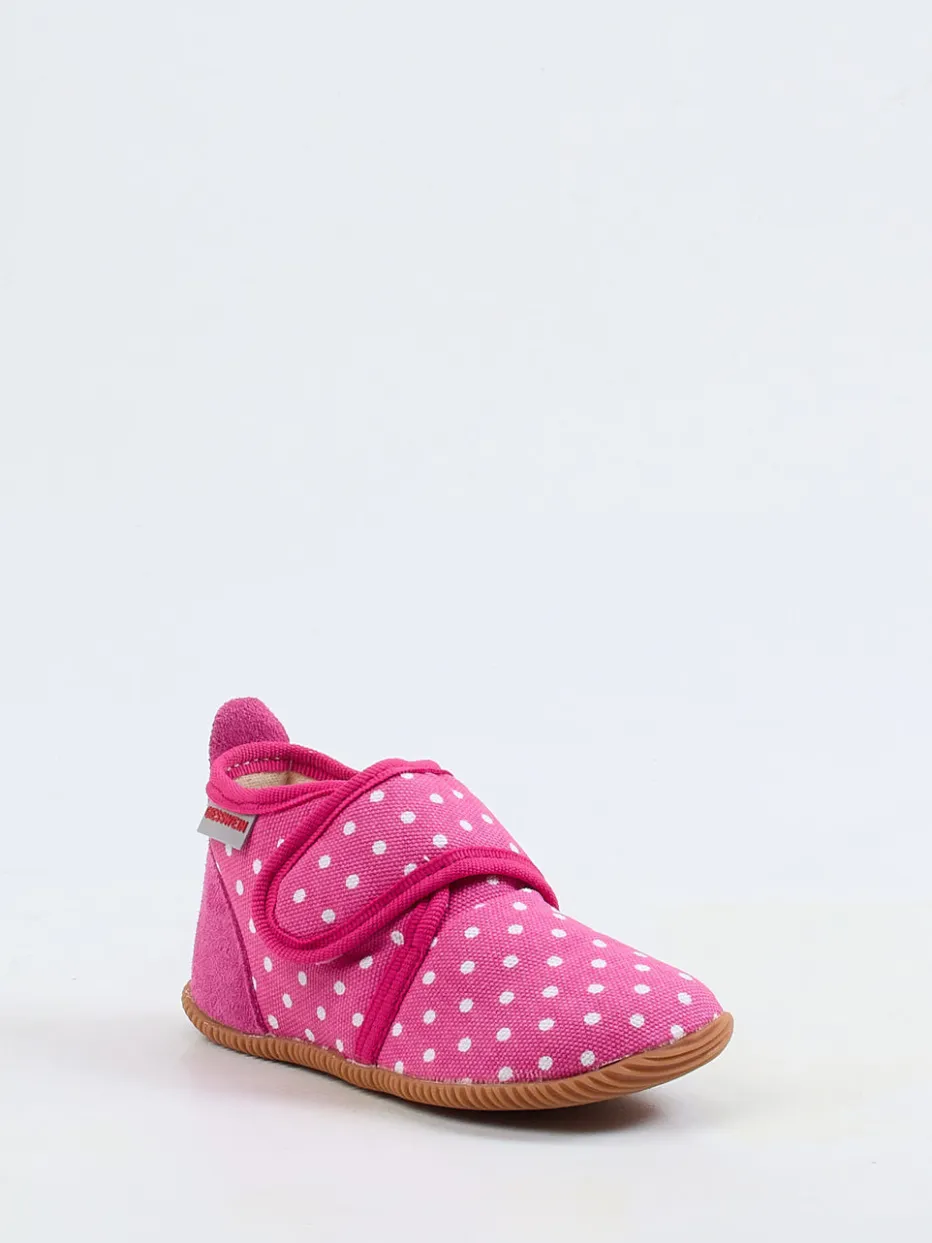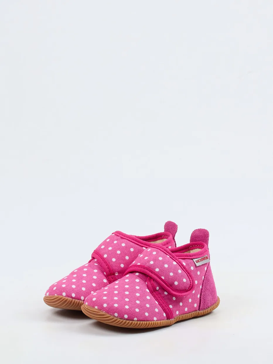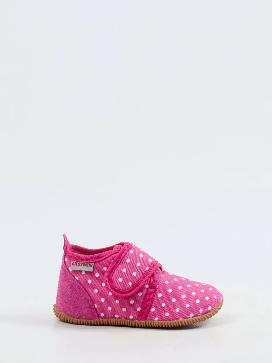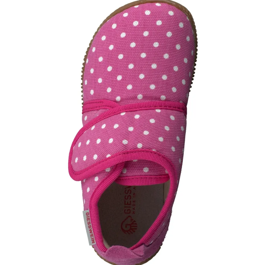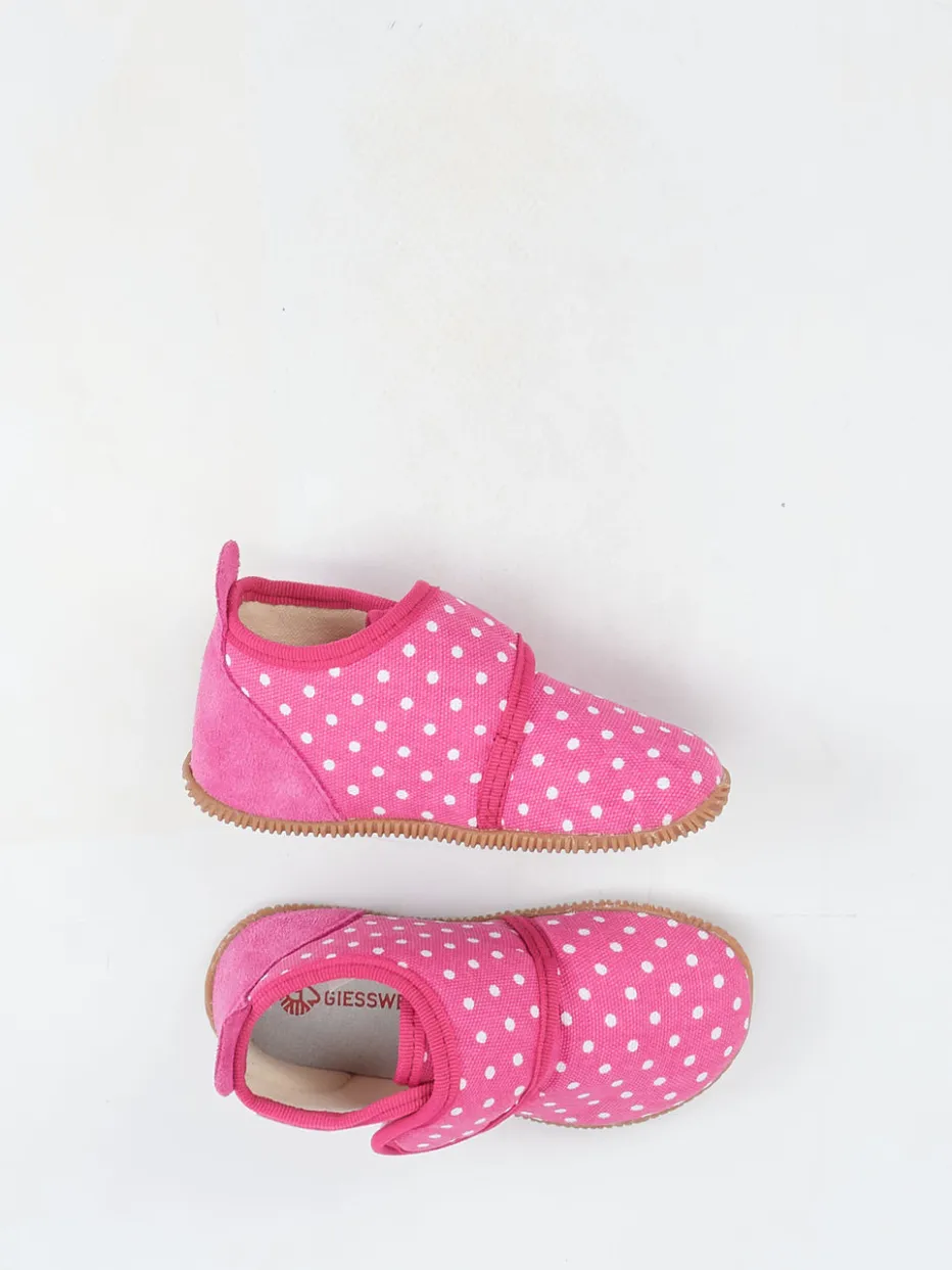 Verspieltes Design trifft Funktionalität.Der Kinderhausschuh von Giesswein begeistert im Alltag mit seinem komfortablen Aufbau und liebevollen Design. Ob beim Spielen im Kinderzimmer oder auf glatten Böden in der Kita – dank der flexiblen, rutschhemmenden Gummisohle bietet das Modell zuverlässigen Halt. Das Obermaterial aus weichem Baumwoll-Canvas ist matt und zeigt ein charmantes weißes Pünktchenmuster auf pinkem Grund. Ein Klettverschluss am Spann erleichtert das Anziehen, während die verstärkte Fersenkappe aus Veloursleder zusätzliche Stabilität gibt. Das Modell folgt Trends wie verspielte Prints und kombiniert sie mit hoher Funktionalität. Ideal zu Pyjama und Kuschelsocken. Kindgerecht durchdacht mit sauberer Verarbeitung – typisch Giesswein.