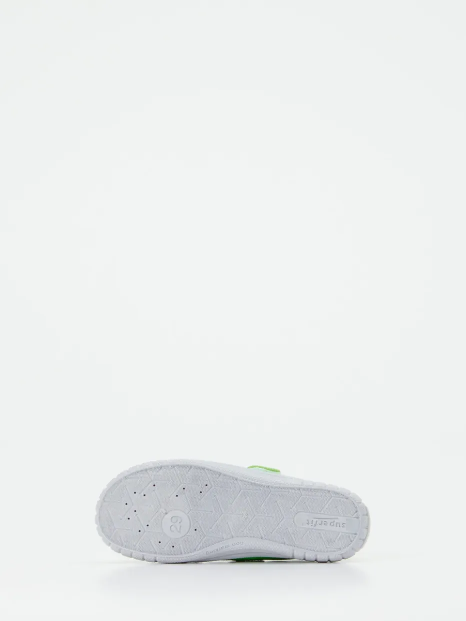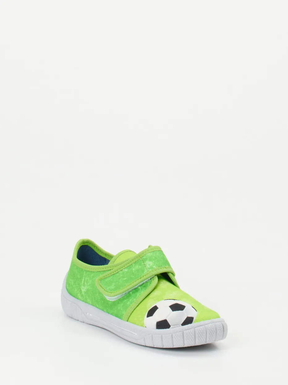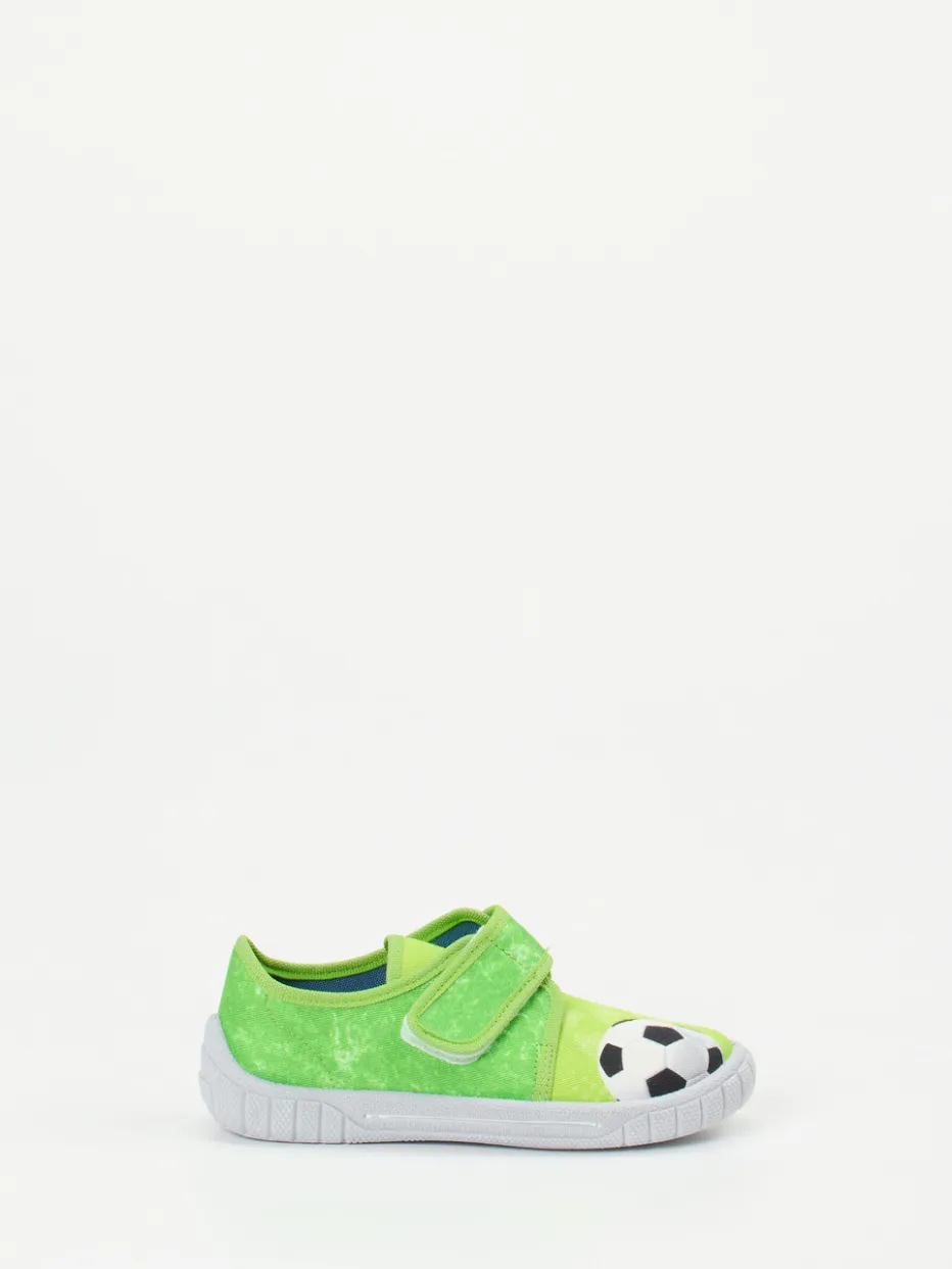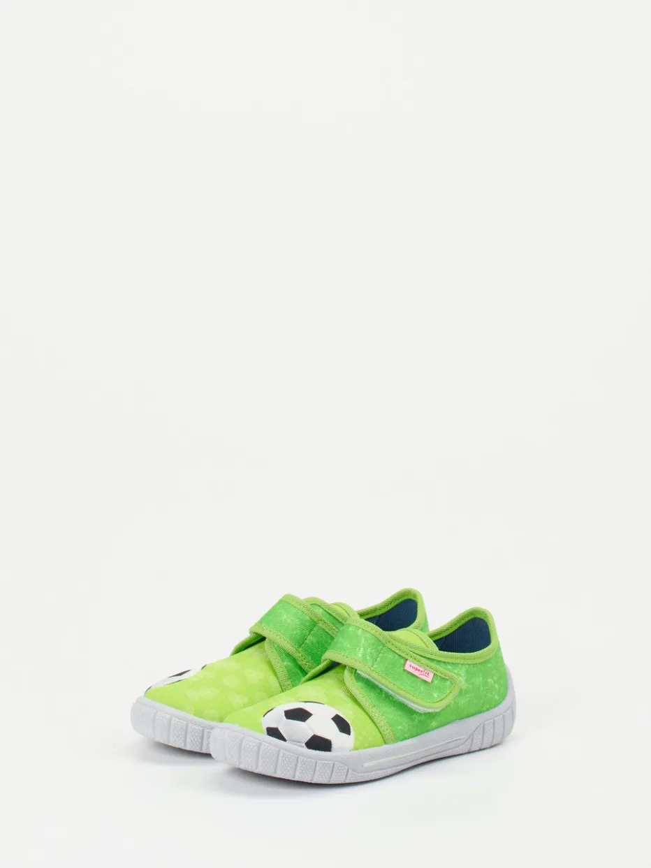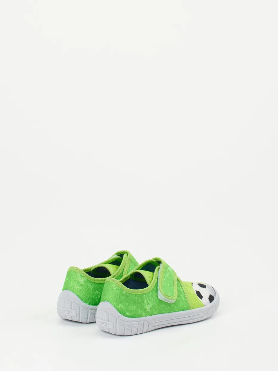 Superfit präsentiert einen grasgrünen Kinder-Hausschuh mit Klettverschluss und fröhlichem Motiv.