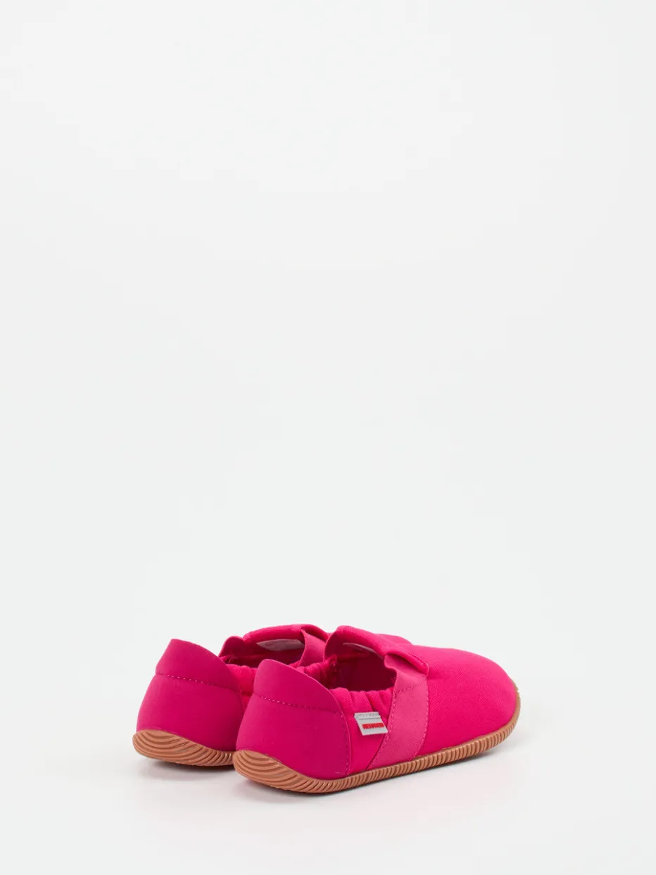 Der atmungsaktive Hausschuh aus pinkfarbenem Textil bietet durch den elastischen Einstieg und die rutschfeste Sohle kindgerechten Komfort für drinnen.
