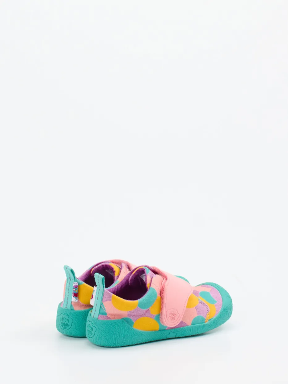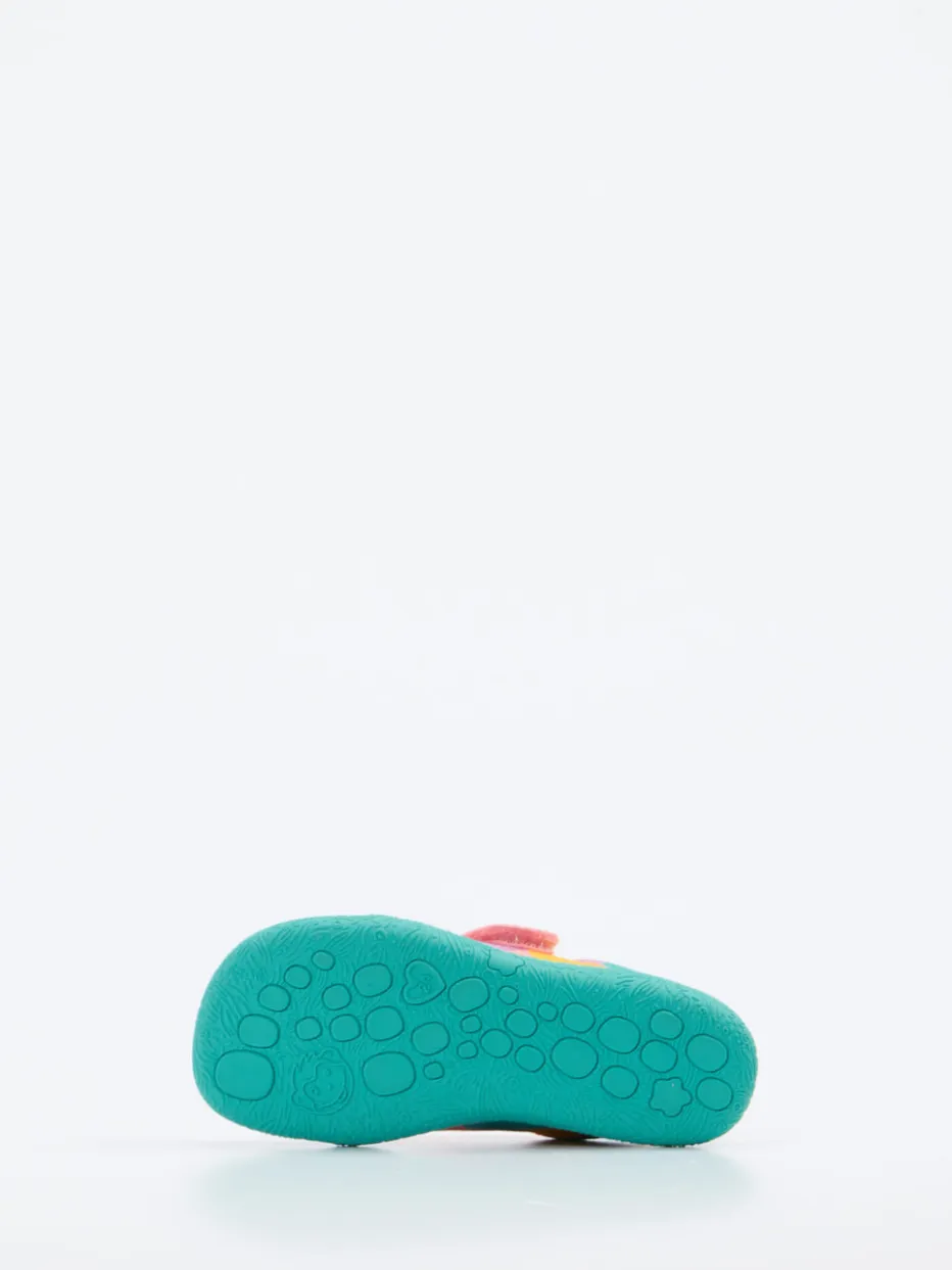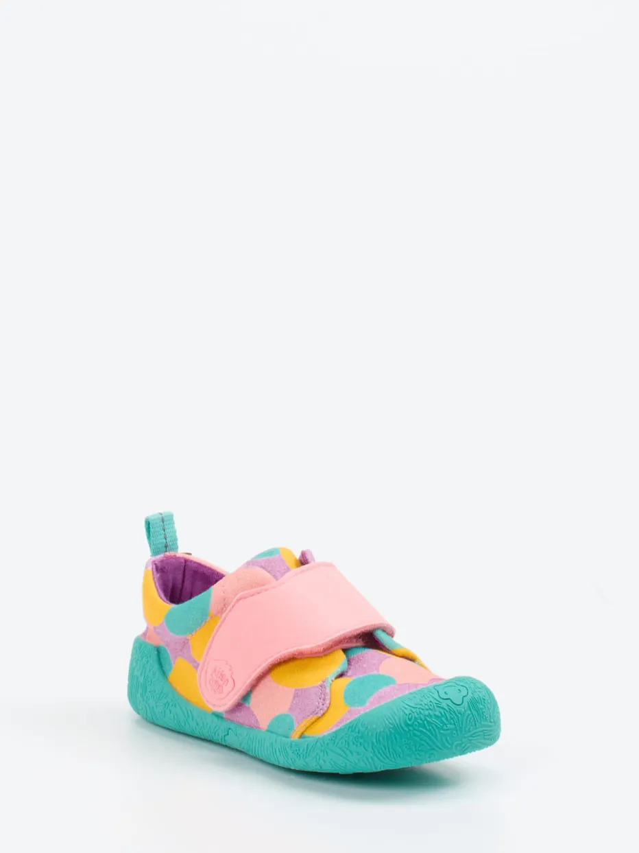 Besonders in der Kita oder zuhause unterstützt der weiche Textilschuh kleine Füße zuverlässig. Der samtig-weiche Oberstoff in Türkis ist mit bunten Punkten verziert und wird durch ein fliederfarbenes Innenfutter ergänzt. Die abgerundete Passform, der breite Klettverschluss sowie eine praktische Zuglasche sorgen für einfaches An- und Ausziehen. Die rutschhemmende Gummisohle ist mit niedlichen Herz- und Tiersymbolen geprägt – ein liebevolles Detail mit Mehrwert. Ideal kombinierbar zu farbenfrohen Kindersocken oder Pyjamas.