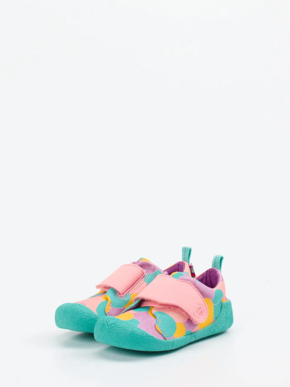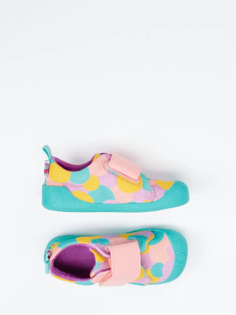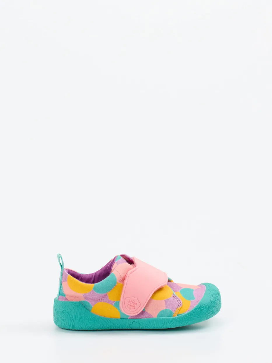 Besonders in der Kita oder zuhause unterstützt der weiche Textilschuh kleine Füße zuverlässig. Der samtig-weiche Oberstoff in Türkis ist mit bunten Punkten verziert und wird durch ein fliederfarbenes Innenfutter ergänzt. Die abgerundete Passform, der breite Klettverschluss sowie eine praktische Zuglasche sorgen für einfaches An- und Ausziehen. Die rutschhemmende Gummisohle ist mit niedlichen Herz- und Tiersymbolen geprägt – ein liebevolles Detail mit Mehrwert. Ideal kombinierbar zu farbenfrohen Kindersocken oder Pyjamas.