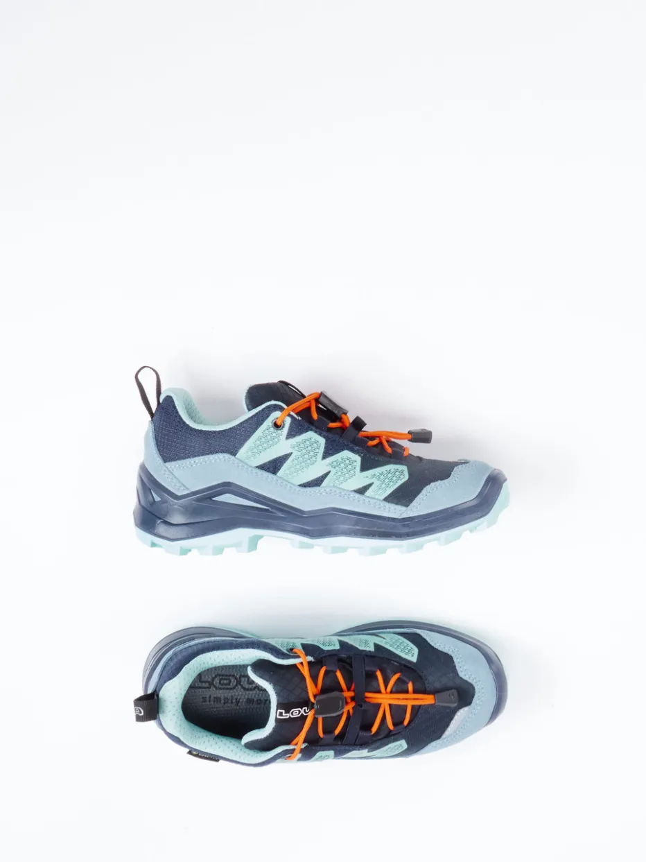 Funktion für jedes Outdoor-Abenteuer.Lowa präsentiert sportlich-kompakte Wanderschuhe für Kinder im Low-Cut-Design. Ideal für aktive Tage im Freien: Die Schuhe kombinieren atmungsaktives Mesh mit samtig angeschliffenem Veloursleder und wasserdichter GORE-TEX-Membran. Auffällige Highlights in Mintgrün mit kontrastfarbener, orangefarbener Schnellschnürung und reflektierenden Details sorgen für Sichtbarkeit und Stil. Die griffige, dunkelblaue Gummisohle bietet sicheren Halt auf unebenem Gelände. Trendgerecht durch Gorpcore-Einflüsse, gleichzeitig funktional und alltagstauglich. Perfekte Balance aus technischer Performance und modernem Outdoor-Styling, wie man es von Lowa erwartet.